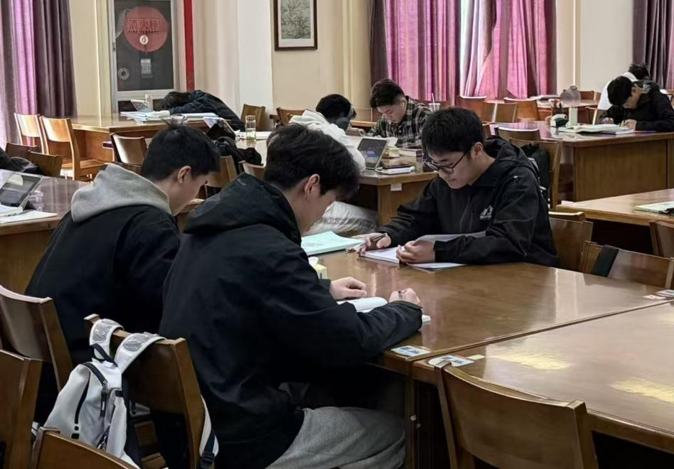 旧书百读,深思自知“旧书不厌百回读,熟读深思子自知。”据了解,他们从2024年3月开始备考。事物的发展总是一个螺旋上升的过程,备考之路也不例外。叶博杰回忆到:“从三月份的装模作样,到七月份的闭关修炼,再到九月份之后的全力冲刺,这一年中,走了许多歪路,做了很多形式主义的事,从早八晚十的自我感动,实际吃完饭还要休息一小时,到早七晚十一的逐渐自觉自律,七月后,时间过得飞快,想必这是进入状态的感觉。”从中我们也能够窥见到好的状态并非是一蹴而就的,走一些弯路总是无可厚非,重要的是能从中汲取养分改造自我,及时调整进入专心的状态。“人生没有白走的路,走的每一步都算数。”同样人生也没有白读的书,读一遍不够就读两遍,两遍不够就三遍四遍……直到将所有的知识都消化。在前期他们稳扎稳打,弄清原理、搭建框架,为后期奠定了坚实的基础,后期再有针对性的进行查漏补缺。据毛鑫楠所说,数学他主要跟的是张宇和武忠祥,光这一门课他就刷了1800题基础篇、1000题加880等等,做了历年所有真题以及近50套模拟卷。他们的政治都开始的比较晚,八月份开始,各种选择题也是二刷三刷形成条件反射。考研复习是一场持久战,专心投入固然重要,但及时复盘更是提升备考效率的关键。因为三人作息相同、进度相似,每天晚上结束图书馆的学习,回寝的路上,便成为了他们重要的复盘交流时间,“你今天学得怎么样?”“这道题有没有更好的解题思路?”几句简单的交流,不仅是对一天学习成果的总结,更是思维碰撞与经验共享的机会。通过这样的复盘,三人既能发现问题、调整策略,又能互相激励、共同进步。这种将反思融入日常的方式,为他们的备考之路注入了源源不断的动力,也让他们在漫长复习中始终保持清晰方向和高昂斗志。