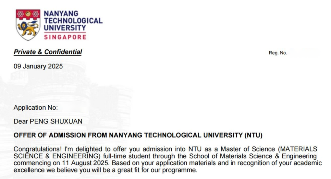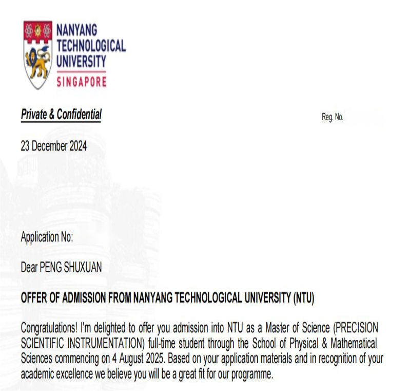 彭枢璇不仅拥有可以高效完成任务的能力,还有勇于克服困难的毅力。道阻且长,行则将至,行而不辍,则未来可期。回忆考研时光,她印象最深刻的是备考雅思的过程。彭枢璇苦学半年,但并没有在考试中取得理想的成绩。残酷的现实与心中预期的结果形成的巨大反差,让彭枢璇逐渐开始怀疑自己,也让她陷入了自我矛盾的心理困境。“岁寒知松柏,患难见真情”,困境中方显情谊之深,师诲之要。彭枢璇的朋友和老师向她伸出了援助之手,她们鼓励彭枢璇相信自己,大胆地去复议考试结果。幸运的是,彭枢璇的复议得到了成功,雅思成绩也从5转变为6.5,这不仅是成绩的提高,更是对她实力的证明——她收到了南洋理工大学(NTU)和新加坡国立大学(NUS)的录取通知书,并最终选择了南洋理工大学。正如泰戈尔所说的:“相信自己,生来如同璀璨的夏日之花,不凋不败,妖冶如火。”有时候我们会怀疑自己,甚至在挫败面前产生放弃的念头,正是这个时候,我们需要提醒自己,相信自己是走出困难的关键,只有内心坚定,才能到达自己期望的彼岸。