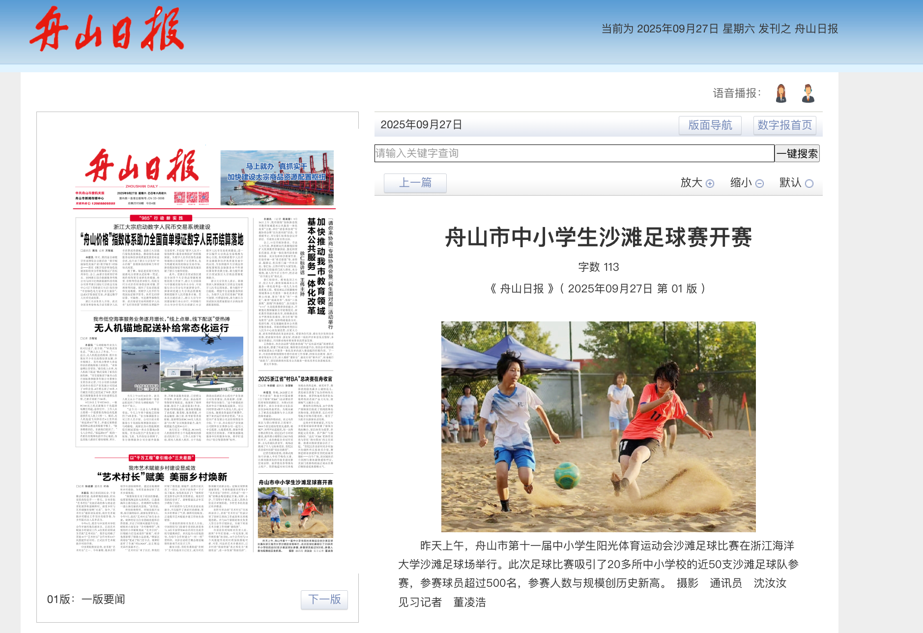 9月26日上午,舟山市第十一届中小学生阳光体育运动会沙滩足球比赛在浙江海洋大学沙滩足球场举行。此次足球比赛吸引了20多所中小学校的近50支沙滩足球队参赛,参赛球员超过500名,参赛人数与规模创历史新高。