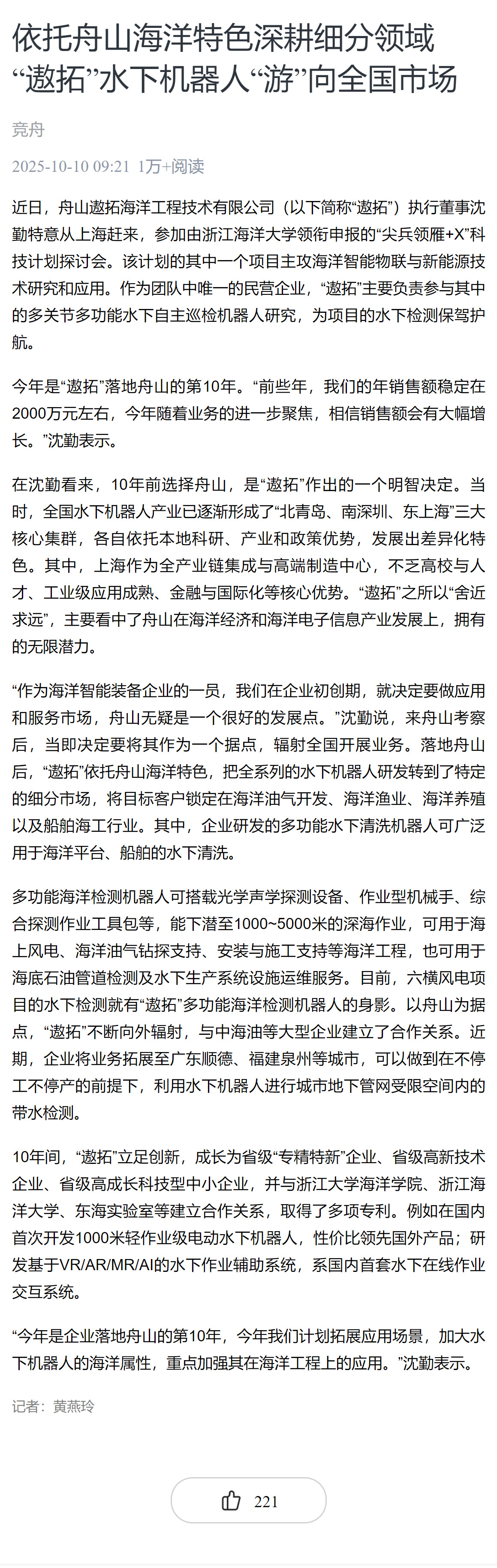 近日,舟山遨拓海洋工程技术有限公司(以下简称“遨拓”)执行董事沈勤特意从上海赶来,参加由浙江海洋大学领衔申报的“尖兵领雁+X”科技计划探讨会。该计划的其中一个项目主攻海洋智能物联与新能源技术研究和应用。作为团队中唯一的民营企业,“遨拓”主要负责参与其中的多关节多功能水下自主巡检机器人研究,为项目的水下检测保驾护航。