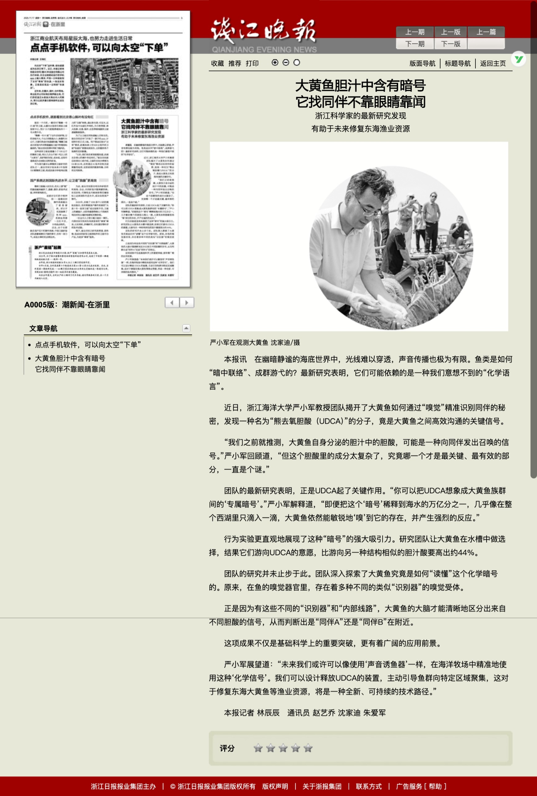 团队的最新研究表明,正是UDCA起了关键作用。“你可以把UDCA想象成大黄鱼族群间的‘专属暗号’。”严小军解释道,“即便把这个‘暗号’稀释到海水的万亿分之一,几乎像在整个西湖里只滴入一滴,大黄鱼依然能敏锐地‘嗅’到它的存在,并产生强烈的反应。”