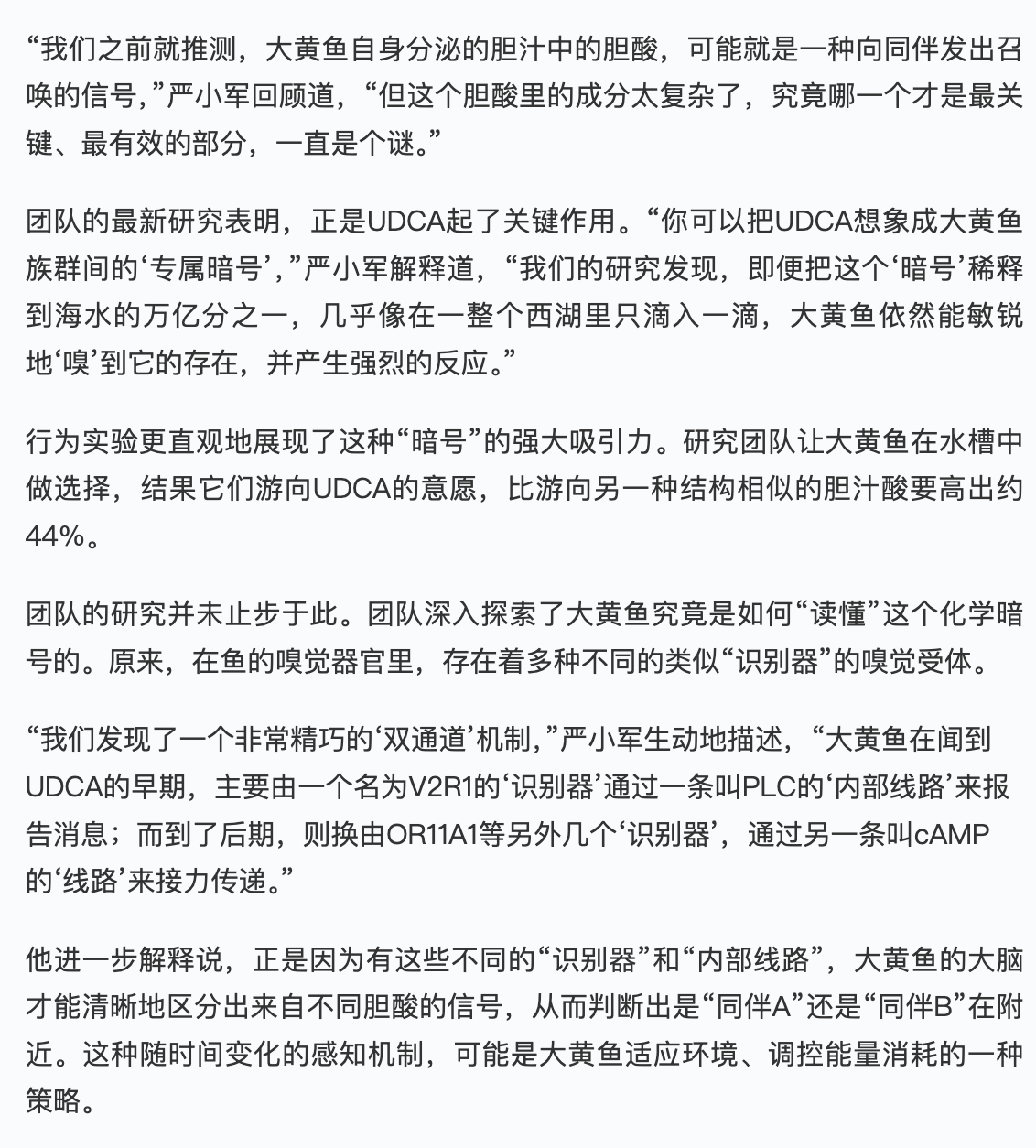团队的最新研究表明,正是UDCA起了关键作用。“你可以把UDCA想象成大黄鱼族群间的‘专属暗号’,”严小军解释道,“我们的研究发现,即便把这个‘暗号’稀释到海水的万亿分之一,几乎像在一整个西湖里只滴入一滴,大黄鱼依然能敏锐地‘嗅’到它的存在,并产生强烈的反应。”
