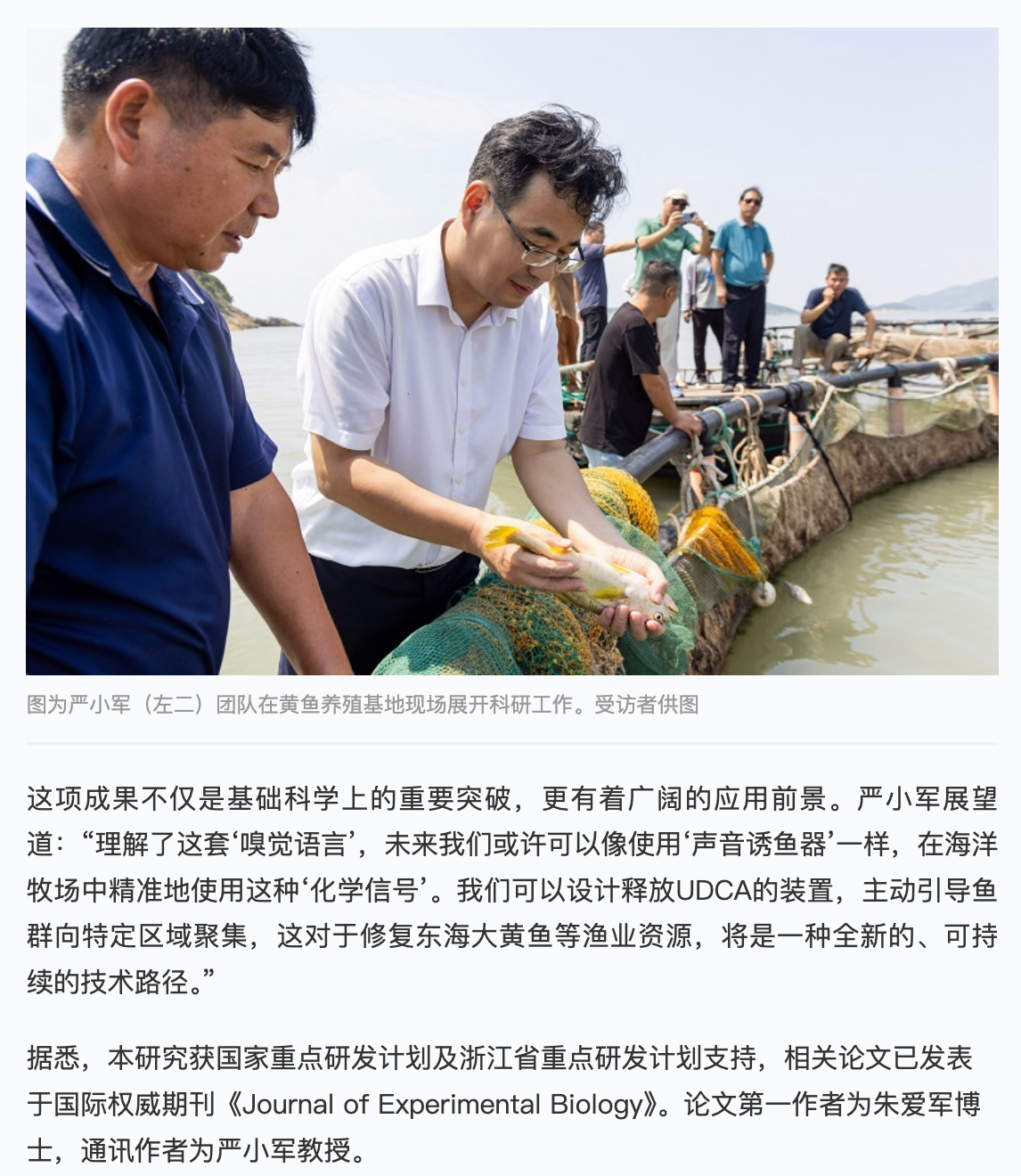 这项成果不仅是基础科学上的重要突破,更有着广阔的应用前景。严小军展望道:“理解了这套‘嗅觉语言’,未来我们或许可以像使用‘声音诱鱼器’一样,在海洋牧场中精准地使用这种‘化学信号’。我们可以设计释放UDCA的装置,主动引导鱼群向特定区域聚集,这对于修复东海大黄鱼等渔业资源,将是一种全新的、可持续的技术路径。”