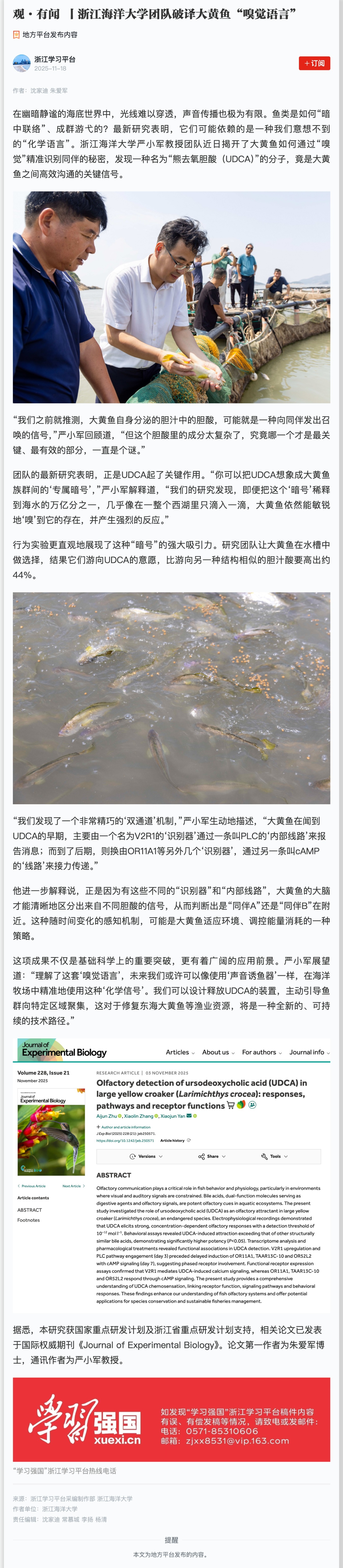 团队的最新研究表明,正是UDCA起了关键作用。“你可以把UDCA想象成大黄鱼族群间的‘专属暗号’,”严小军解释道,“我们的研究发现,即便把这个‘暗号’稀释到海水的万亿分之一,几乎像在一整个西湖里只滴入一滴,大黄鱼依然能敏锐地‘嗅’到它的存在,并产生强烈的反应。”