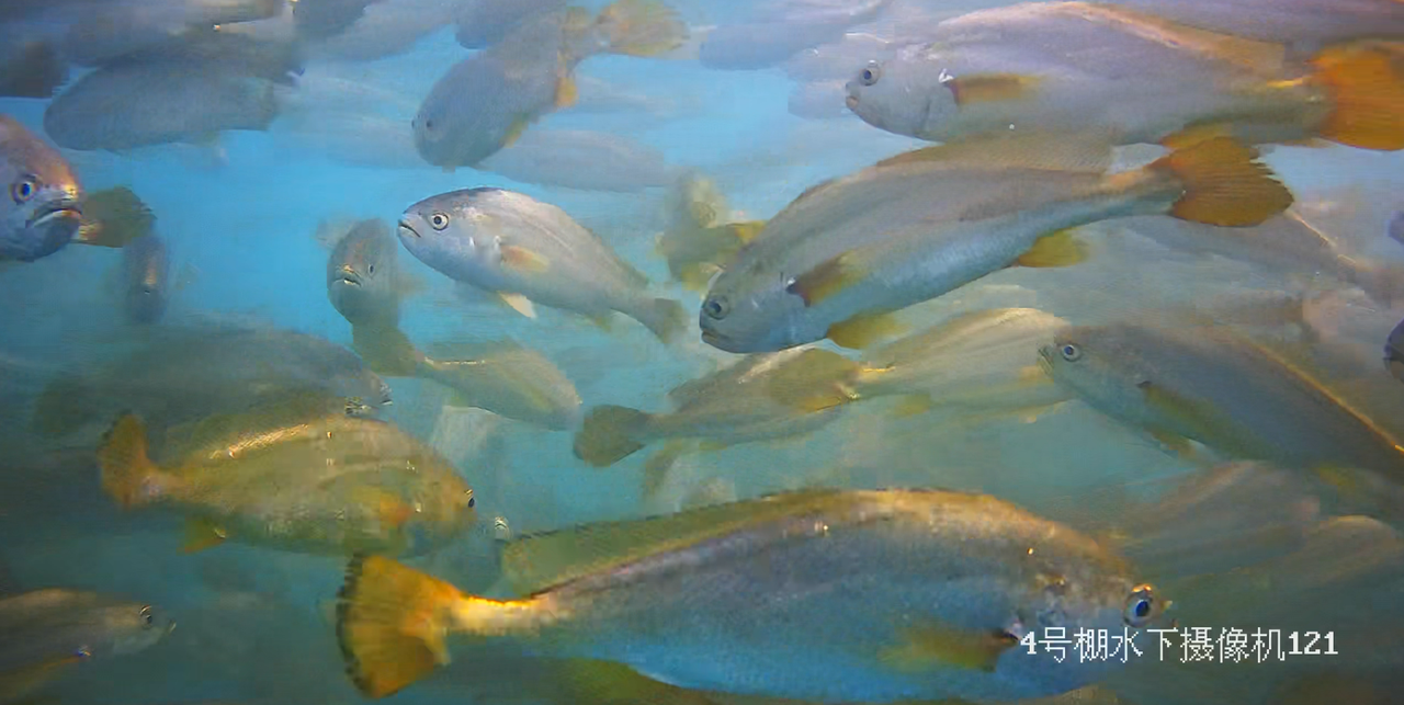 监控画面下,大黄鱼陆海接力养殖基地养殖池内的大黄鱼群。受访者供图