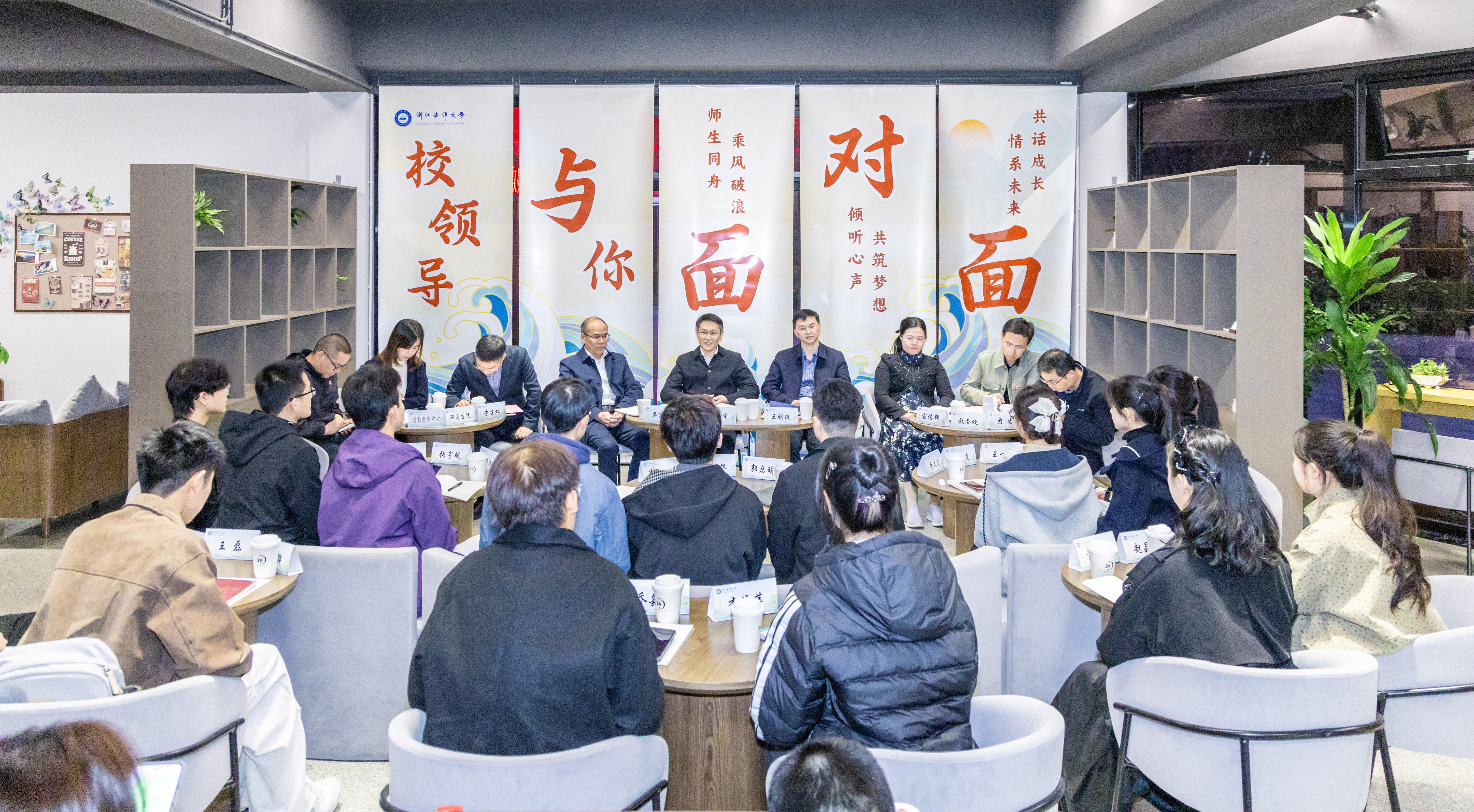 11月18日下午,浙江海洋大学举行第二期“校领导与你面对面”活动。校长武传宇、校党委副书记王剑俊、副校长吴高峰等校领导出席活动,与2025级本、硕、博新生代表亲切交流,共话成长之路。