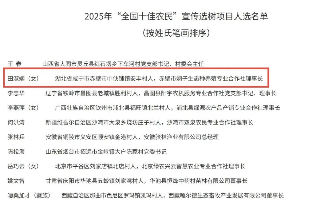 为大力宣传推介扎根农村的优秀农民代表充分调动广大农民群众积极性经中华农业科教基金会组织推荐、遴选和公示确定2025年“全国十佳农民”人选我校优秀校友田淑娴成功入选
