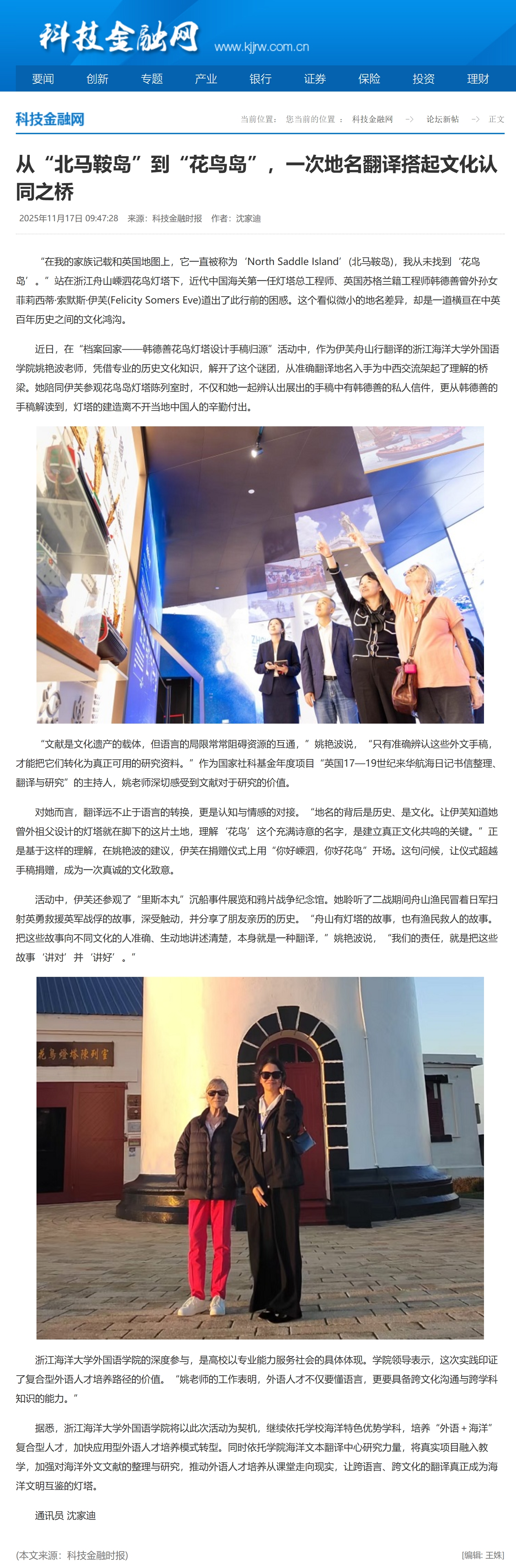 “在我的家族记载和英国地图上,它一直被称为‘NorthSaddleIsland’(北马鞍岛),我从未找到‘花鸟岛’。”站在浙江舟山嵊泗花鸟灯塔下,近代中国海关第一任灯塔总工程师、英国苏格兰籍工程师韩德善曾外孙女菲莉西蒂·索默斯·伊芙(FelicitySomersEve)道出了此行前的困惑。这个看似微小的地名差异,却是一道横亘在中英百年历史之间的文化鸿沟。近日,在“档案回家——韩德善花鸟灯塔设计手稿归源”活动中,作为伊芙舟山行翻译的浙...