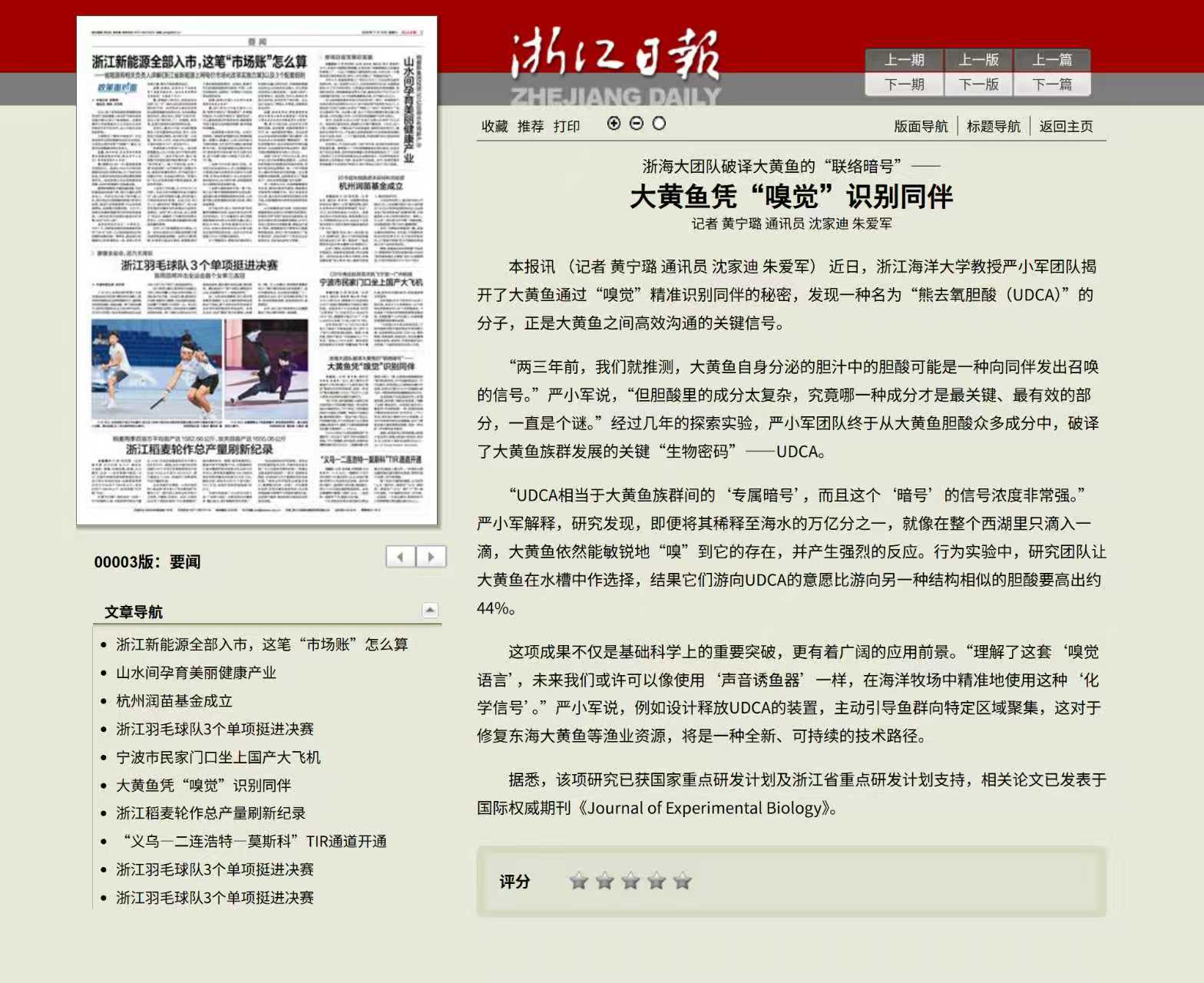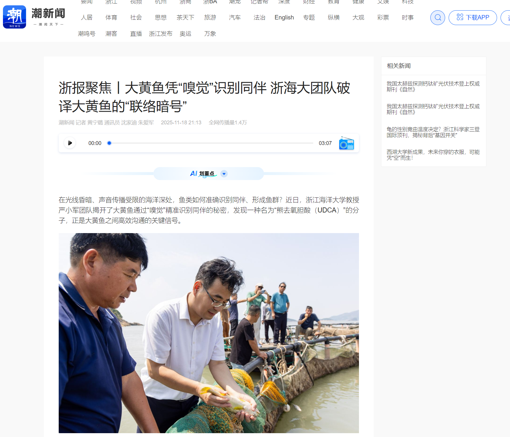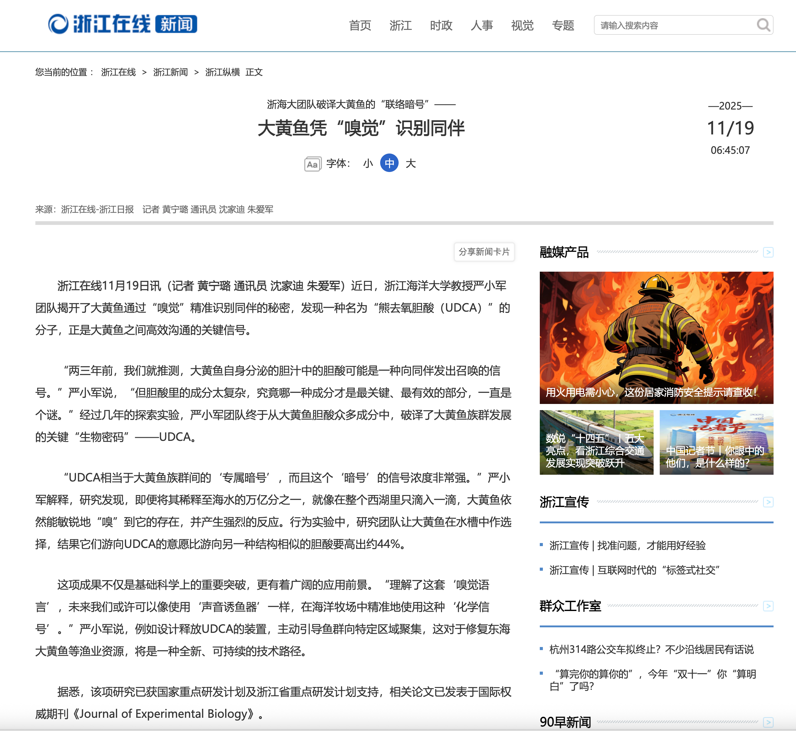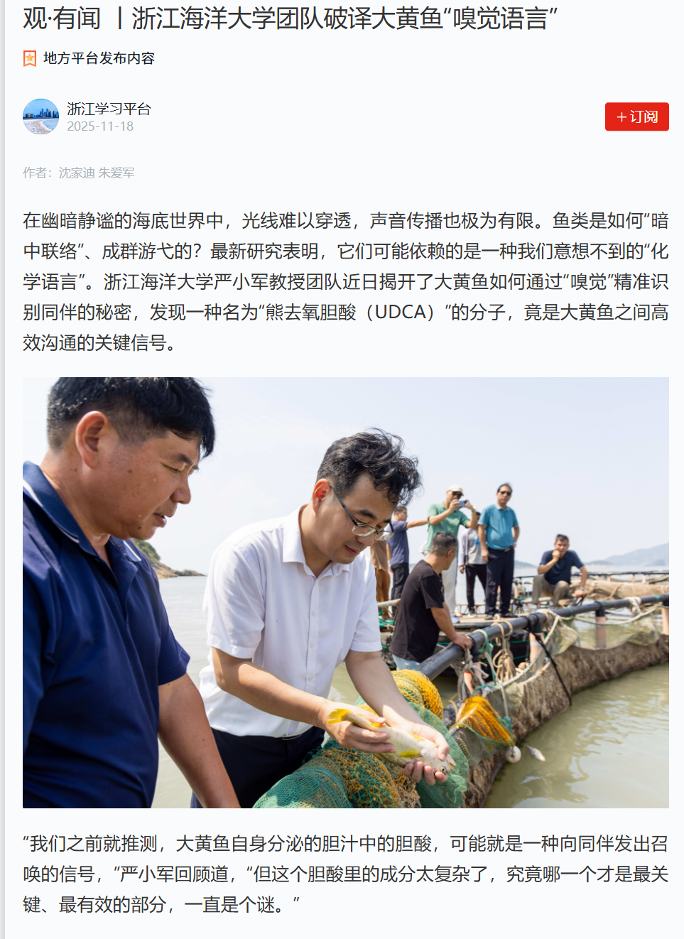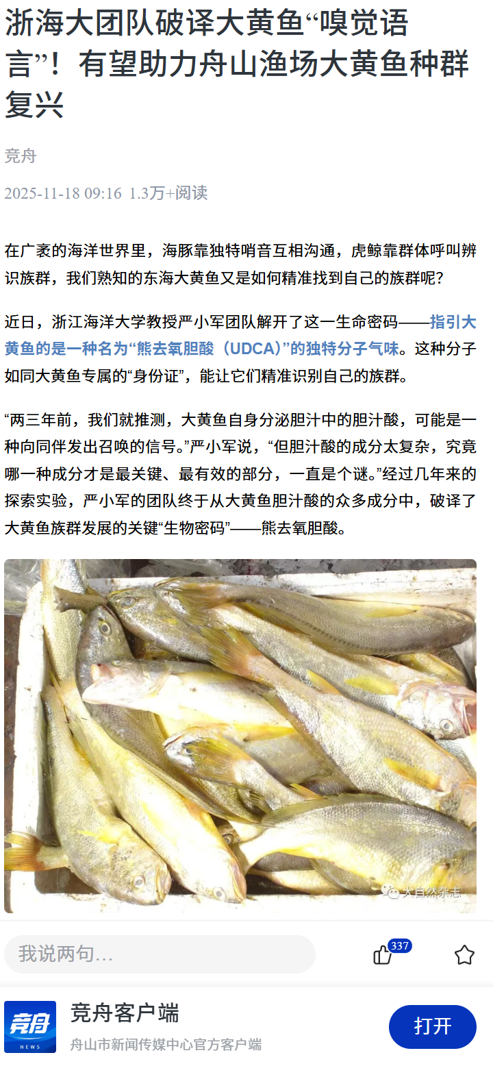 2025-11-18 来源:浙江教育报 作者:*幽暗静谧的海底世界里,光线难以穿透,声音传播也极为有限。鱼类是如何“暗中联络”、成群游弋的?“它们可能依赖的是一种我们意想不到的‘化学语言’”。浙江海洋大学严小军教授说,研究团队发现了一种名为“熊去氧胆酸(UDCA)”的分子是大黄鱼之间高效沟通的关键信号。“我们之前就推测,大黄鱼自身分泌的胆汁中的胆酸,可能就是一种向同伴发出召唤的信号。”严小军表示,“但这个胆酸里的成分太复杂了,究竟哪一个才是最关...