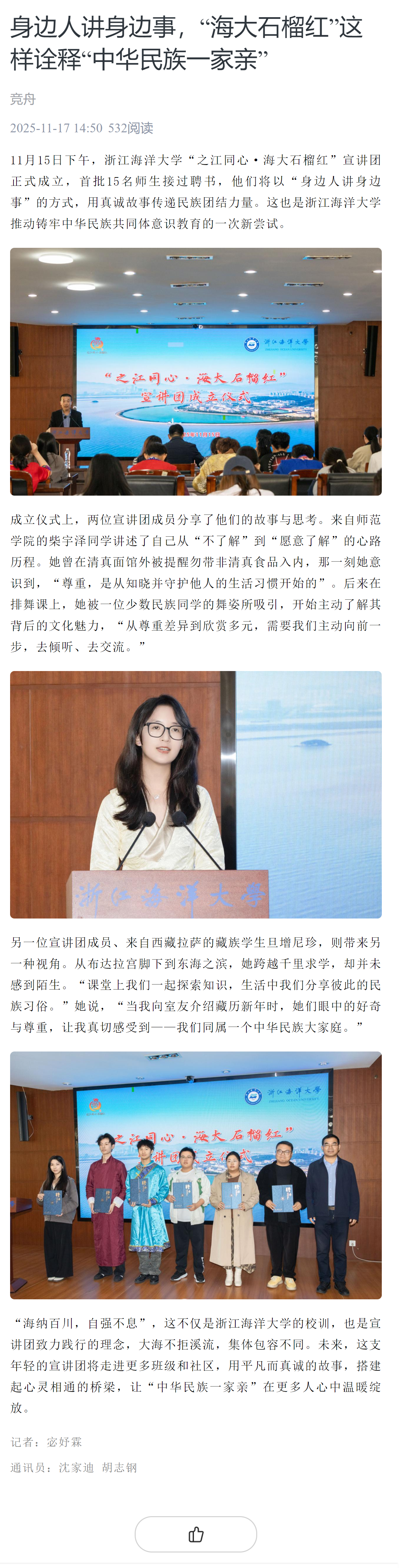 2025-11-17 来源:《钱江晚报》 作者:*11月15日下午,浙江海洋大学“之江同心·海大石榴红”宣讲团正式成立,首批15名师生接过聘书,他们将以“身边人讲身边事”的方式,用真诚故事传递民族团结力量。成立仪式上,两位宣讲团成员分享了他们的故事与思考。来自师范学院的柴宇泽同学讲述了自己从“不了解”到“愿意了解”的心路历程。她曾在清真面馆外被提醒勿带非清真食品入内,那一刻她意识到,“尊重,是从知晓并守护他人的生活习惯开始的”。后来在排舞课上,她被一...