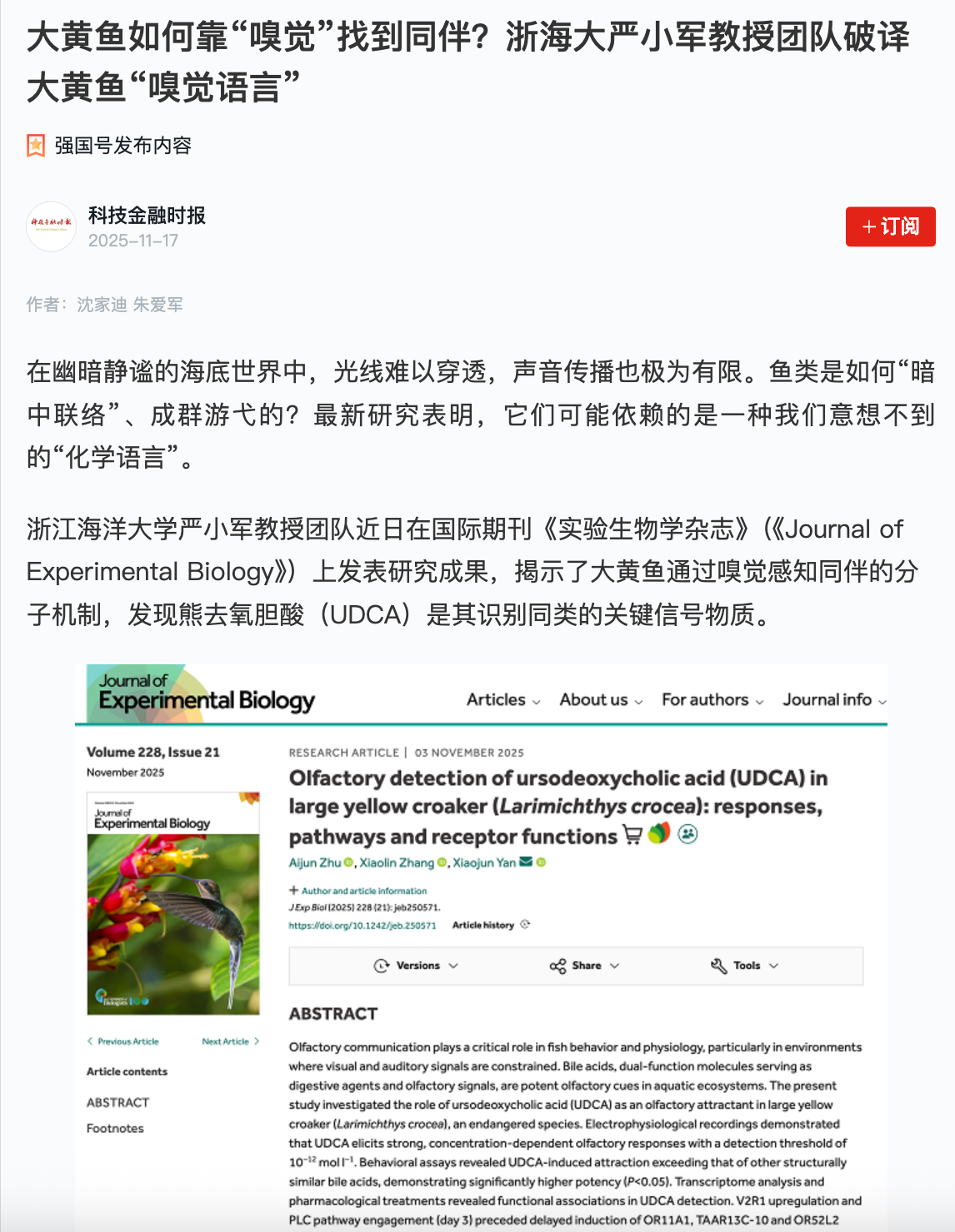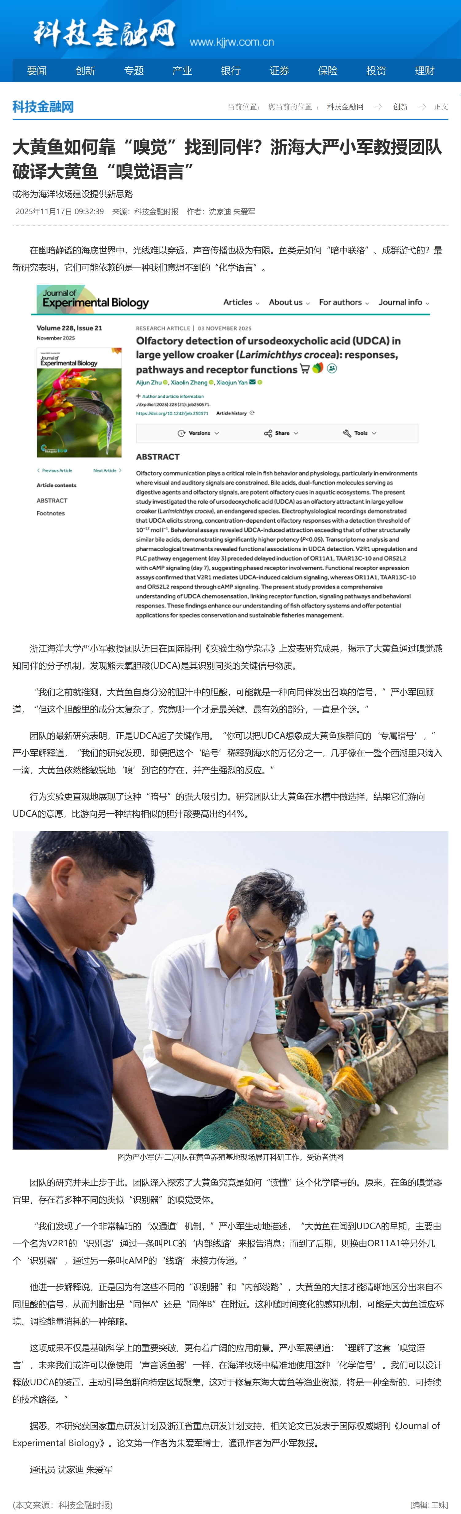 在幽暗静谧的海底世界中,光线难以穿透,声音传播也极为有限。鱼类是如何“暗中联络”、成群游弋的?最新研究表明,它们可能依赖的是一种我们意想不到的“化学语言”。浙江海洋大学严小军教授团队近日在国际期刊《实验生物学杂志》上发表研究成果,揭示了大黄鱼通过嗅觉感知同伴的分子机制,发现熊去氧胆酸(UDCA)是其识别同类的关键信号物质。“我们之前就推测,大黄鱼自身分泌的胆汁中的胆酸,可能就是一种向同伴发出召唤的信...