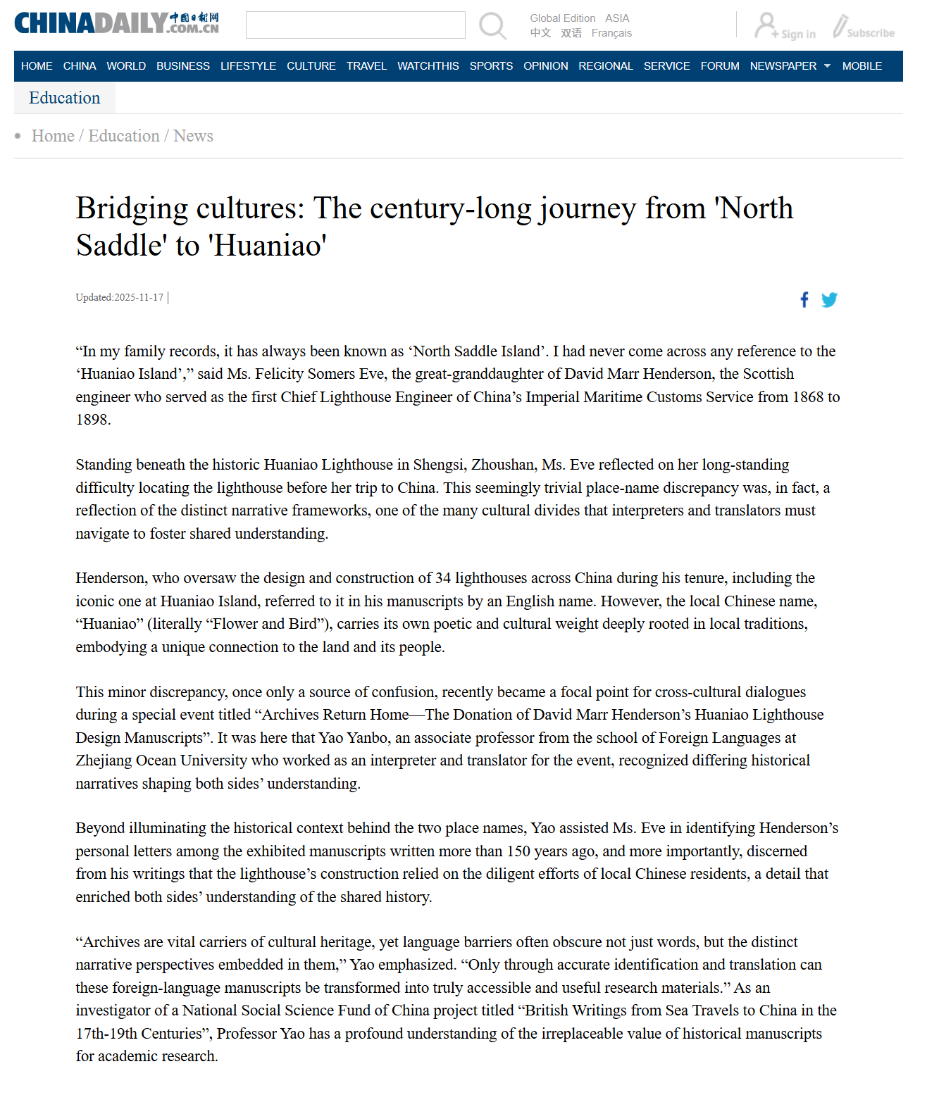 “Inmyfamilyrecords,ithasalwaysbeenknownas‘NorthSaddleIsland’.Ihadnevercomeacrossanyreferencetothe‘HuaniaoIsland’,”saidMs.FelicitySomersEve,thegreat-granddaughterofDavidMarrHenderson,theScottishengineerwhoservedasthefirstChiefLighthouseEngineerofChina’sImperialMaritimeCustomsServicefrom1868to1898.StandingbeneaththehistoricHuaniaoLighthouseinShengsi,Zhoushan,Ms.Evereflectedonherlong-standi...