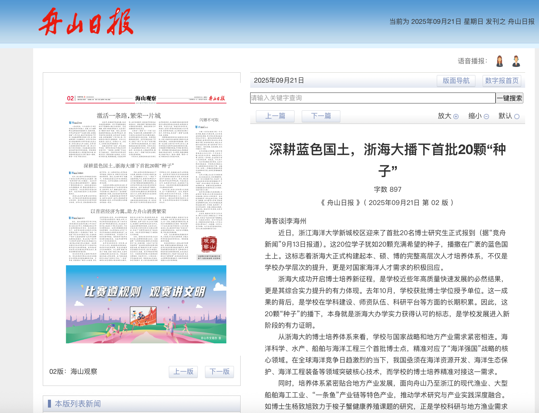 2025-09-19 来源:《舟山晚报》 作者:*Copyright©2019 浙江海洋大学新闻中心浙公网安备 33090002000195号地址:浙江省舟山市定海区临城街道海大南路1号电话:0580-2550020传真:0580-2551319