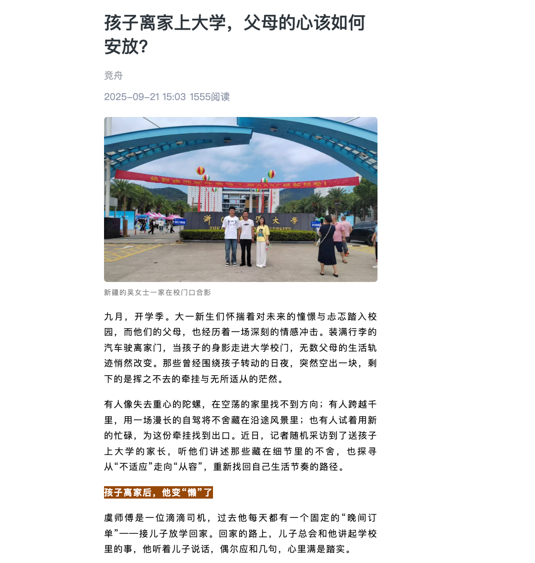2025-09-21 来源:微言教育 作者:*九月,开学季。大一新生们怀揣着对未来的憧憬与忐忑踏入校园,而他们的父母,也经历着一场深刻的情感冲击。装满行李的汽车驶离家门,当孩子的身影走进大学校门,无数父母的生活轨迹悄然改变。那些曾经围绕孩子转动的日夜,突然空出一块,剩下的是挥之不去的牵挂与无所适从的茫然。有人像失去重心的陀螺,在空荡的家里找不到方向;有人跨越千里,用一场漫长的自驾将不舍藏在沿途风景里;也有人试着用新的忙碌,为这份牵挂找到出...