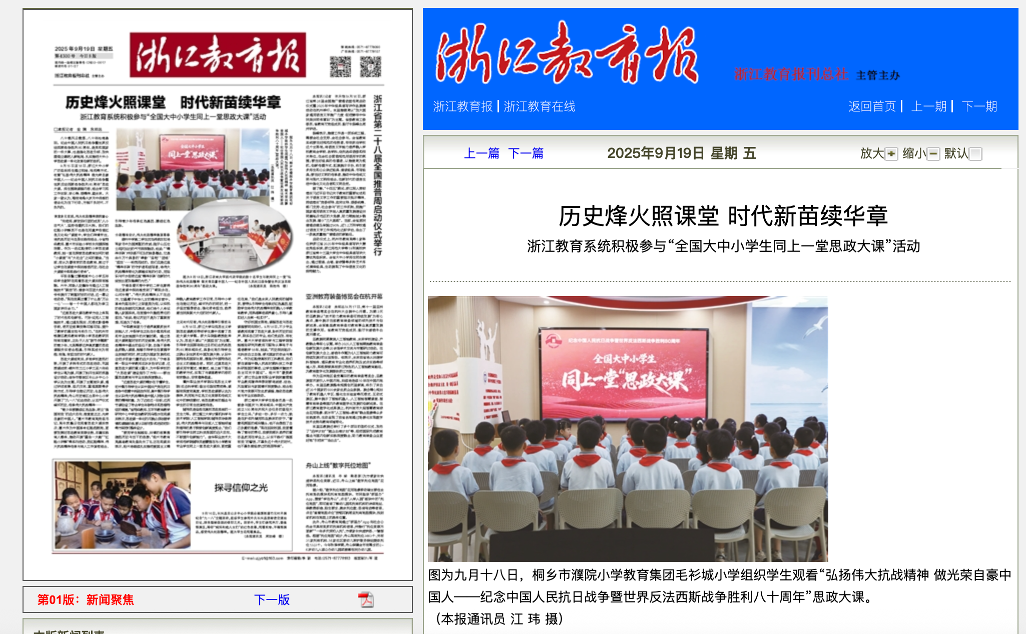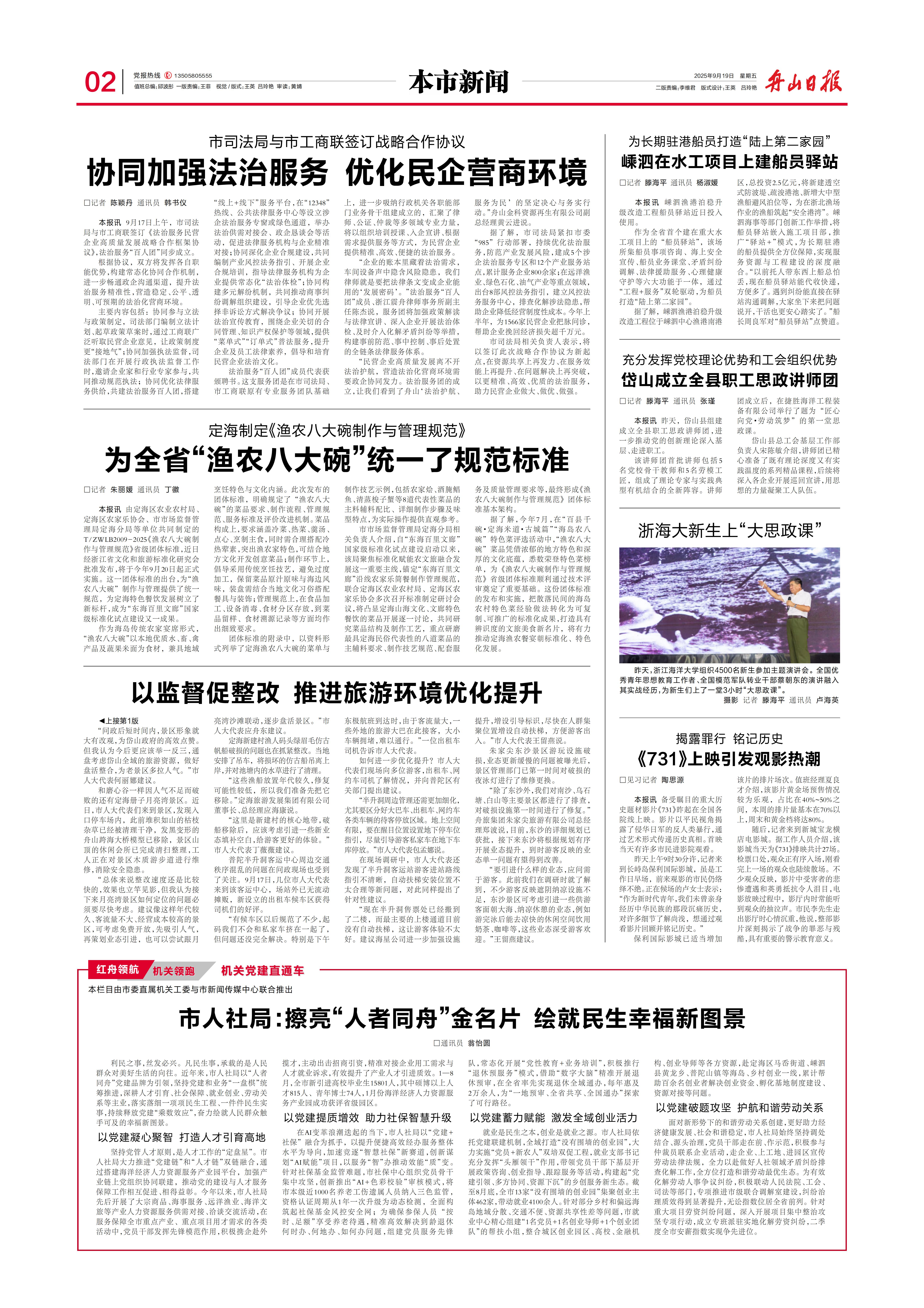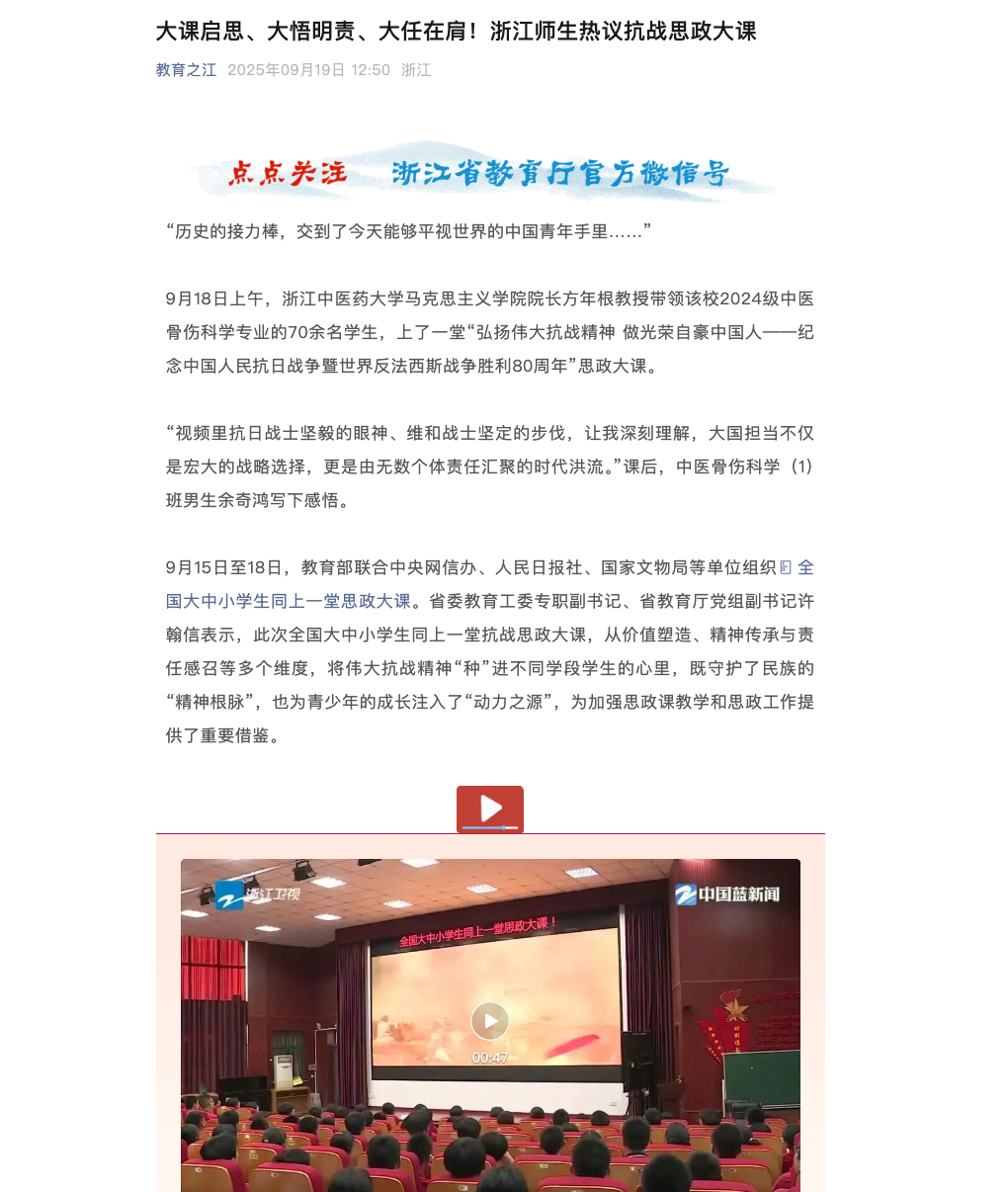 2025-09-21 来源:《舟山日报》 作者:*伟大抗战精神历久弥新,是立德树人的宝贵资源。我们要将其与“海纳百川,自强不息”校训相融合,构建海洋特色思政体系,引导学生坚定蓝色信念、增强海洋报国本领,为海洋强国建设贡献浙海大力量。(相关链接:https://mp.weixin.qq.com/s/IcIhqgWMr-HecmmKO8IkvA