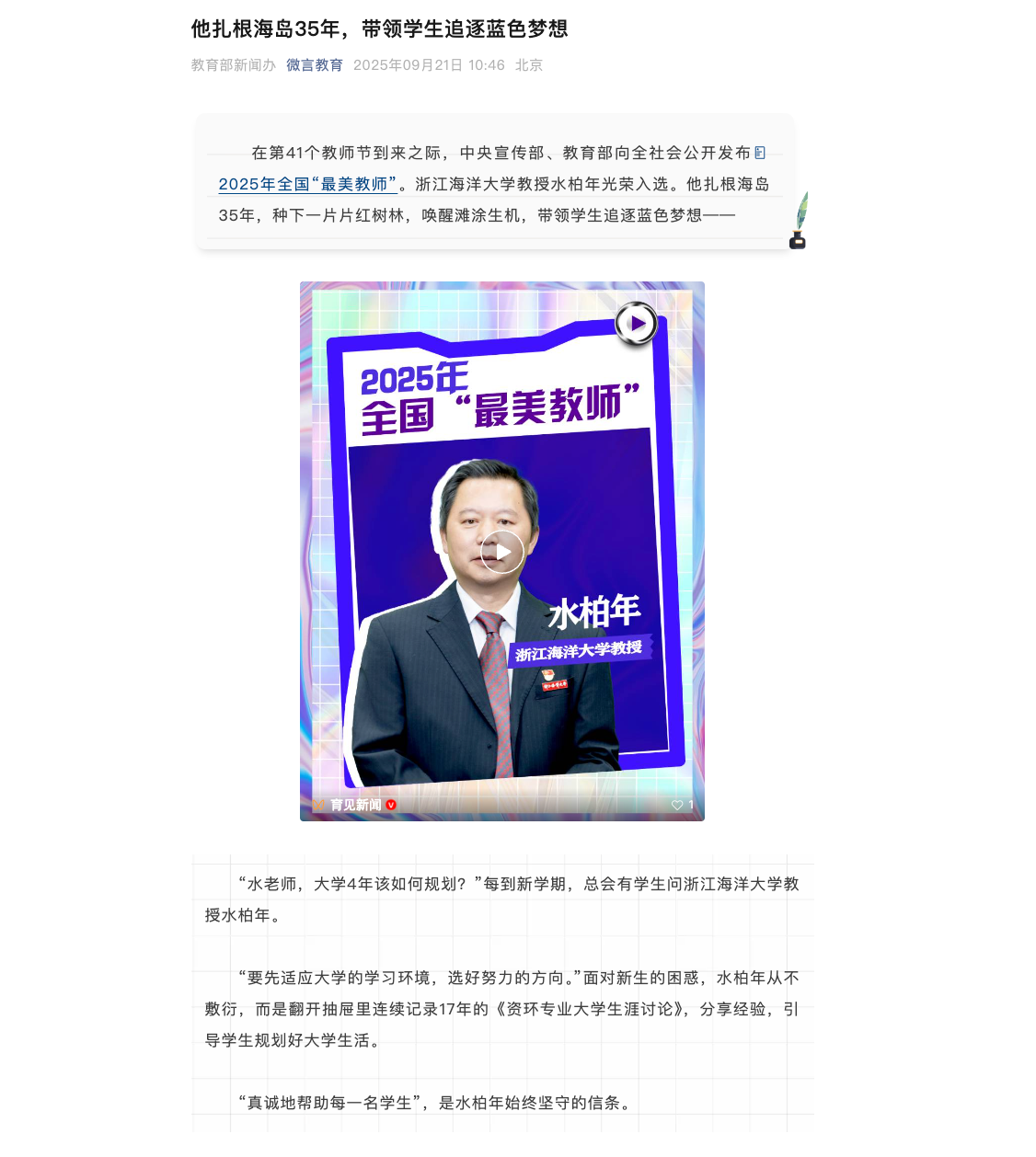 2025-09-22 来源:CCTV17 作者:*在第41个教师节到来之际,中央宣传部、教育部向全社会公开发布2025年全国“最美教师”。浙江海洋大学教授水柏年光荣入选。他扎根海岛35年,种下一片片红树林,唤醒滩涂生机,带领学生追逐蓝色梦想——“水老师,大学4年该如何规划?”每到新学期,总会有学生问浙江海洋大学教授水柏年。“要先适应大学的学习环境,选好努力的方向。”面对新生的困惑,水柏年从不敷衍,而是翻开抽屉里连续记录17年的《资环专业大学生涯讨论》,分...