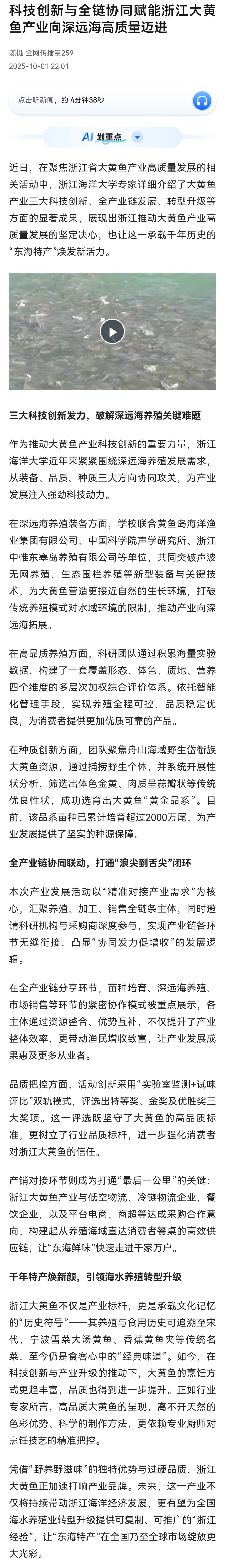 2025-10-07 来源:浙江在线 作者:*活动现场,浙江海洋大学党委书记严小军详细介绍《大黄鱼品质等级评价技术规范》,按照形态、体色、质地和营养四大维度建立综合评价体系,为大黄鱼的生产、检验、贸易和消费提供统一的技术依据,推动浙江省大黄鱼产业迈入标准化高质量发展新阶段。(相关链接:https://m.chinanews.com/wap/detail/chs/zw/1214418hevsfxedf.shtml#ocr