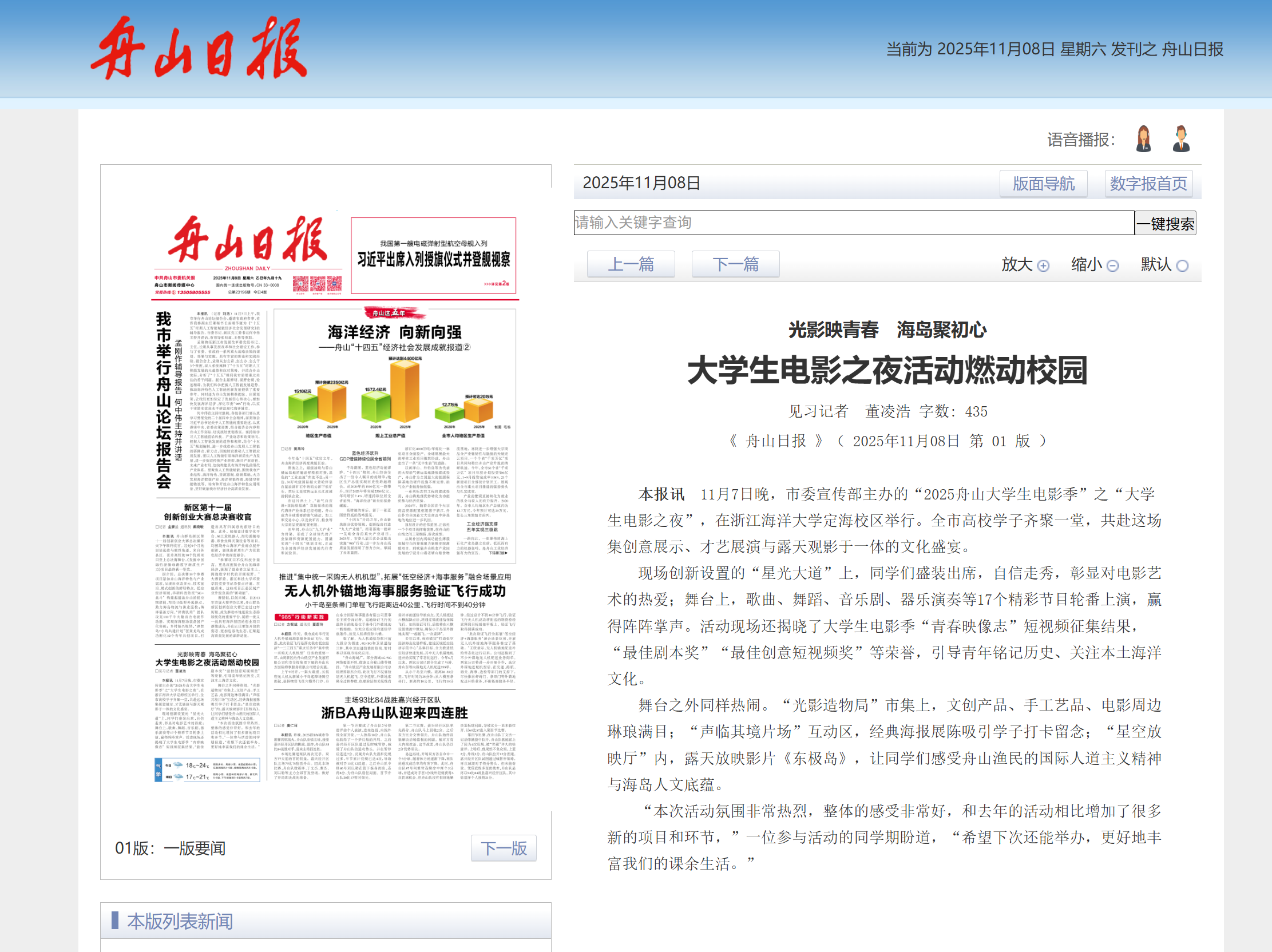 11月7日晚,市委宣传部主办的“2025舟山大学生电影季”之“大学生电影之夜”,在浙江海洋大学定海校区举行。全市高校学子齐聚一堂,共赴这场集创意展示、才艺展演与露天观影于一体的文化盛宴。现场创新设置的“星光大道”上,同学们盛装出席,自信走秀,彰显对电影艺术的热爱;舞台上,歌曲、舞蹈、音乐剧、器乐演奏等17个精彩节目轮番上演,赢得阵阵掌声。活动现场还揭晓了大学生电影季“青春映像志”短视频征集结果,“最佳剧...