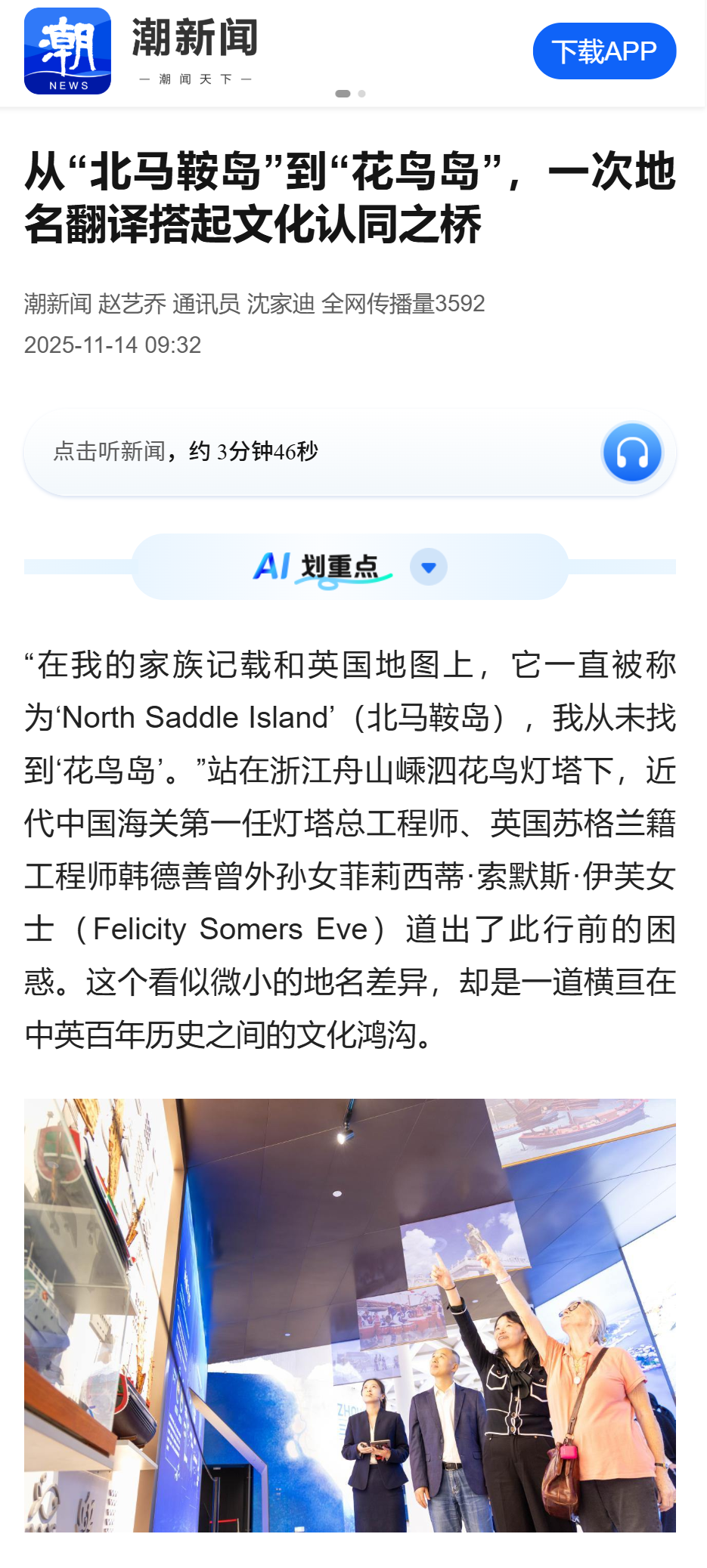 “在我的家族记载和英国地图上,它一直被称为‘NorthSaddleIsland’(北马鞍岛),我从未找到‘花鸟岛’。”站在浙江舟山嵊泗花鸟灯塔下,近代中国海关第一任灯塔总工程师、英国苏格兰籍工程师韩德善曾外孙女菲莉西蒂·索默斯·伊芙女士(FelicitySomersEve)道出了此行前的困惑。这个看似微小的地名差异,却是一道横亘在中英百年历史之间的文化鸿沟。近日,在“档案回家——韩德善花鸟灯塔设计手稿归源”活动中,作为伊芙女士舟...