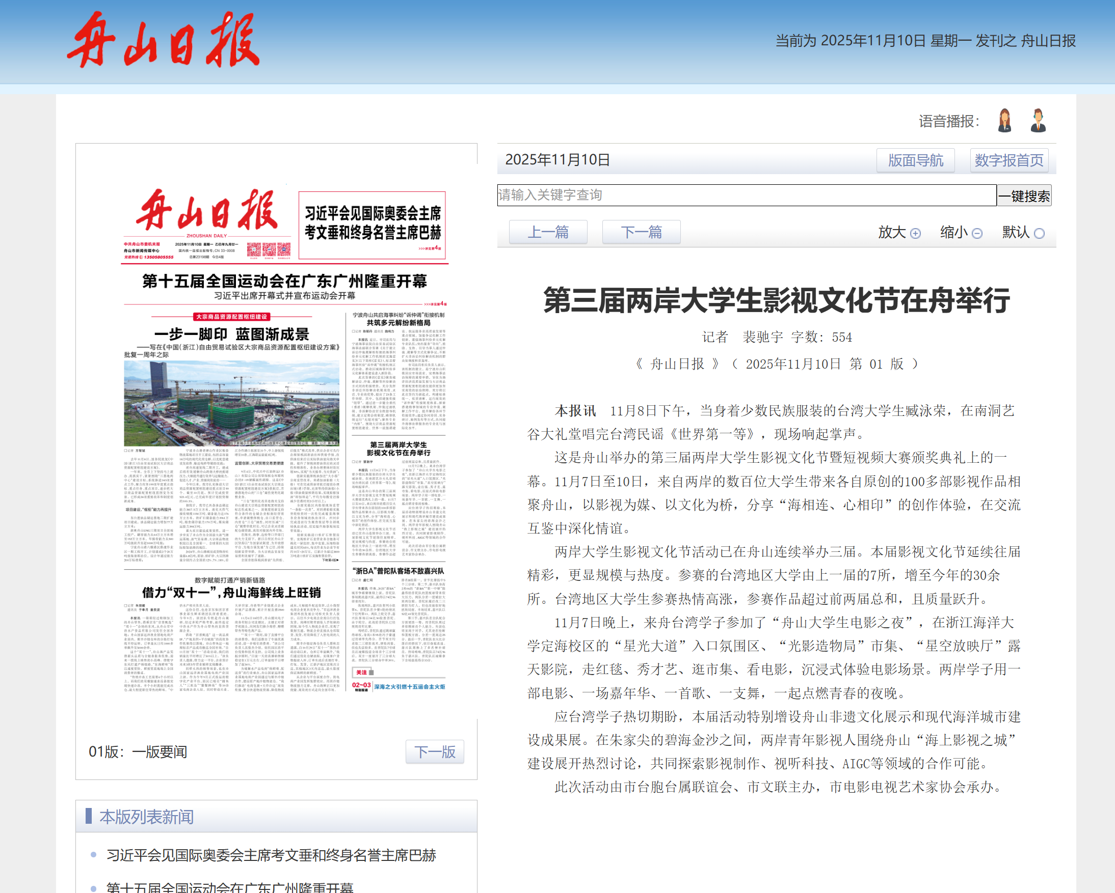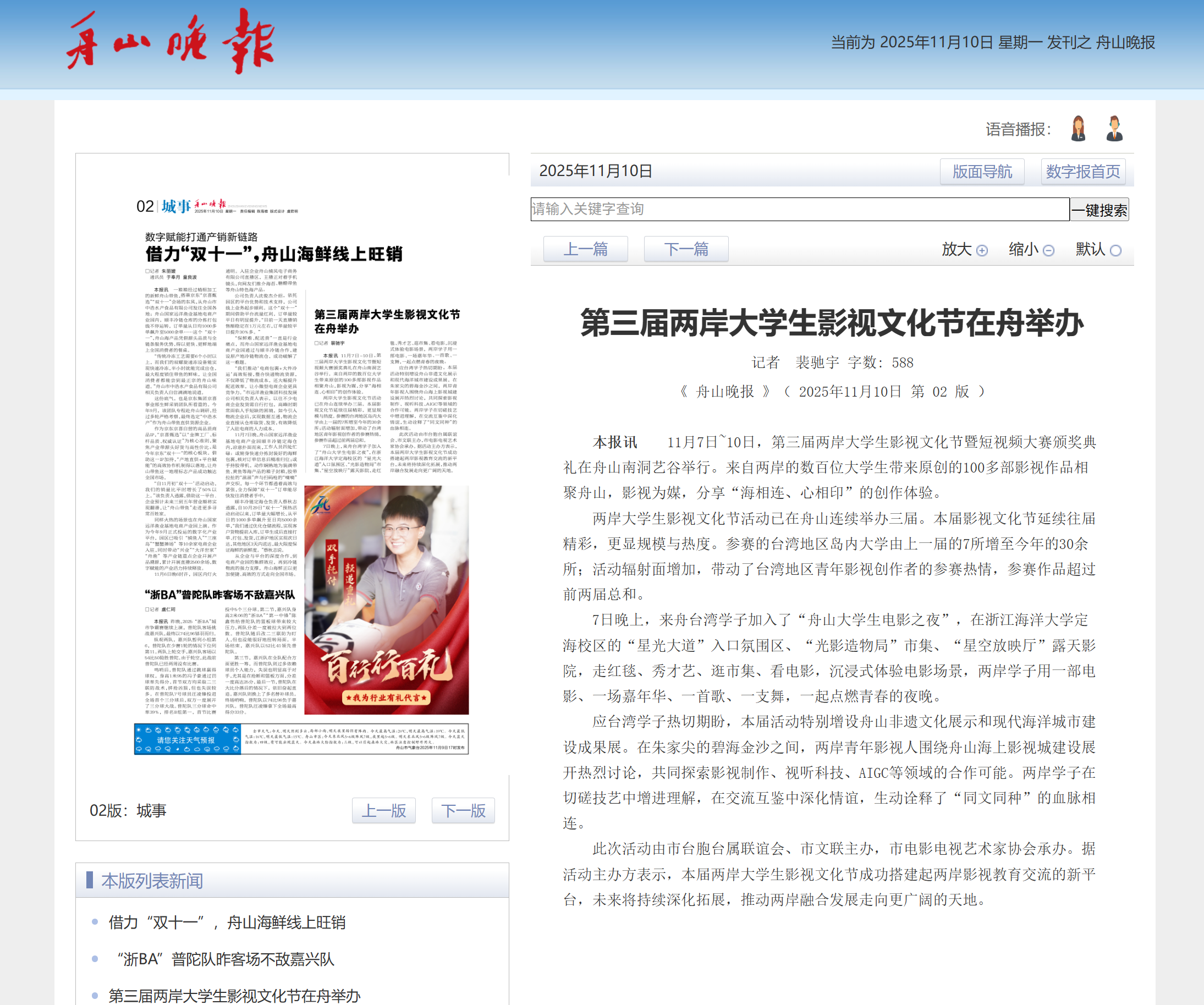 本报讯11月8日下午,当身着少数民族服装的台湾大学生臧泳荣,在南洞艺谷大礼堂唱完台湾民谣《世界第一等》,现场响起掌声。这是舟山举办的第三届两岸大学生影视文化节暨短视频大赛颁奖典礼上的一幕。11月7日至10日,来自两岸的数百位大学生带来各自原创的100多部影视作品相聚舟山,以影视为媒、以文化为桥,分享“海相连、心相印”的创作体验,在交流互鉴中深化情谊。两岸大学生影视文化节活动已在舟山连续举办三届。本届影视文...