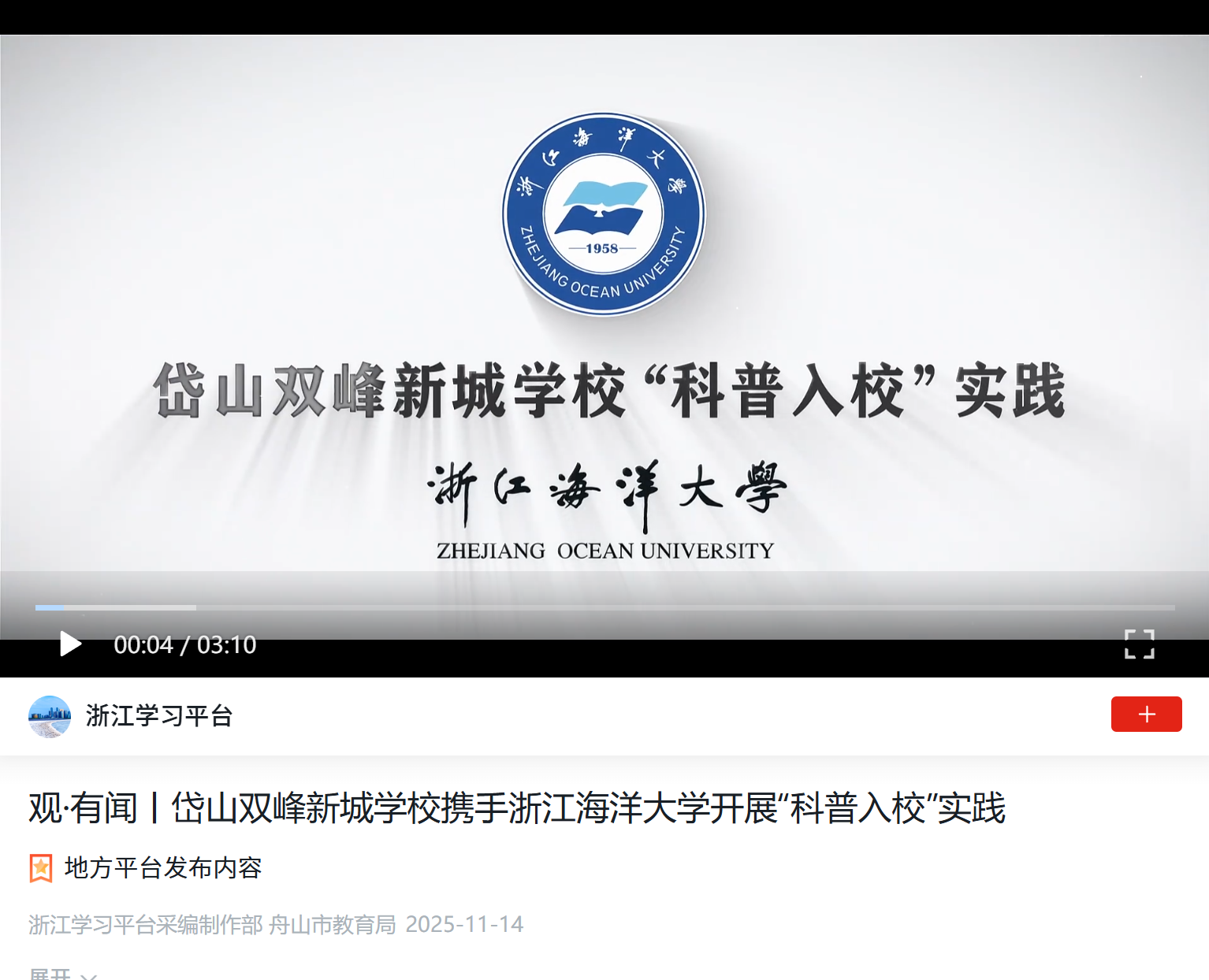 2025年秋季起,舟山市岱山双峰新城学校与浙江海洋大学合作,引入两支博士教学团队,开设人工智能+3D打印、海洋生物与环保跨学科科普课,每周二、四下午开课,每学期36学时。学校安排教师随堂学习,还计划以此孵化科技社团,推动科学教育内生发展。(相关链接:https://article.xuexi.cn/articles/index.html?share_to=wx_single&study_style_id=video_default&source=share&art_id=11953857545652956678&item_i...