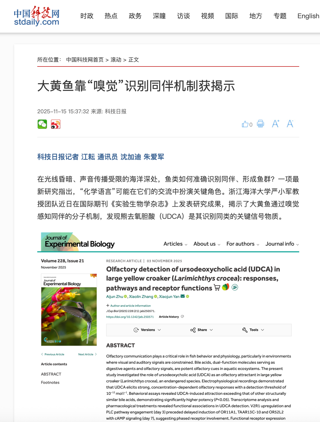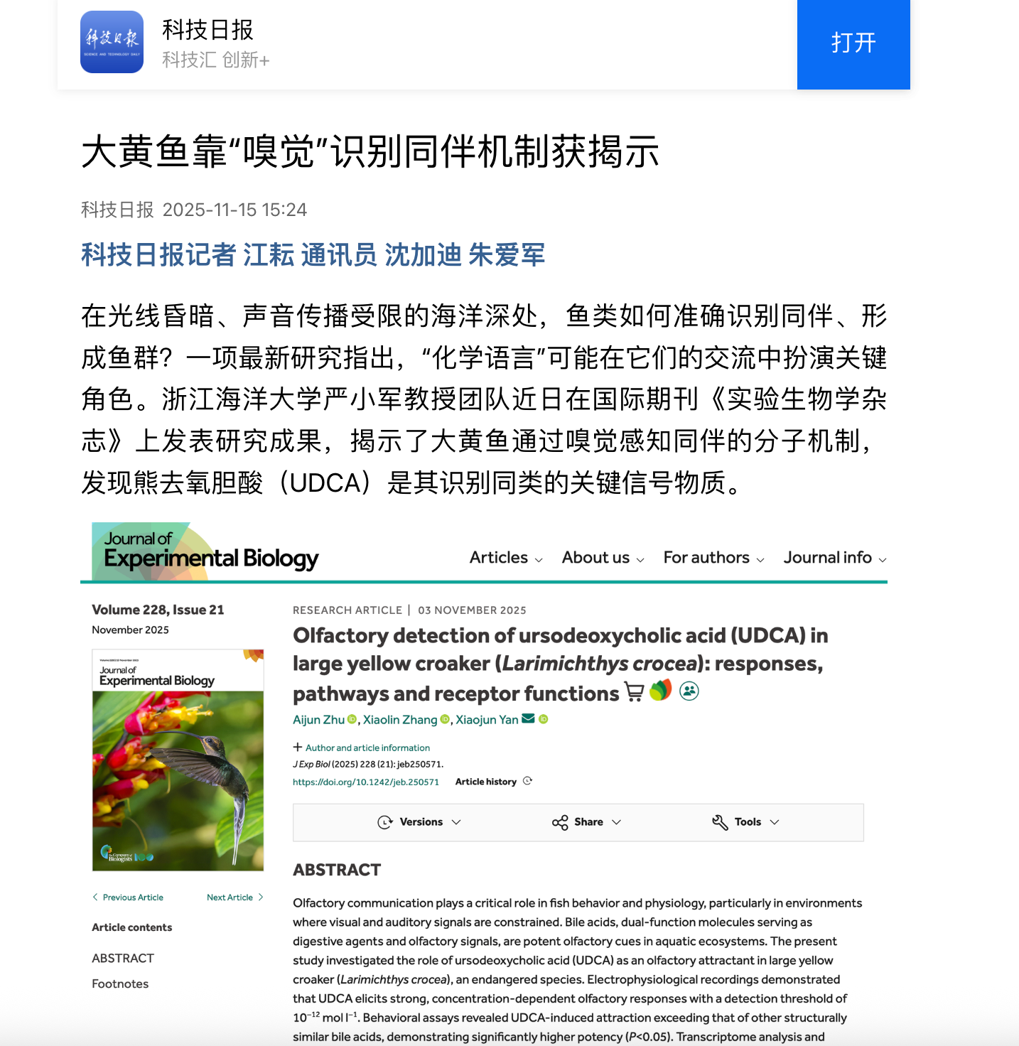 在光线昏暗、声音传播受限的海洋深处,鱼类如何准确识别同伴、形成鱼群?一项最新研究指出,“化学语言”可能在它们的交流中扮演关键角色。浙江海洋大学严小军教授团队近日在国际期刊《实验生物学杂志》上发表研究成果,揭示了大黄鱼通过嗅觉感知同伴的分子机制,发现熊去氧胆酸(UDCA)是其识别同类的关键信号物质。严小军介绍,团队此前已推测大黄鱼可能通过自身分泌的胆汁酸向同伴传递信息,但由于胆汁酸成分复杂,关键活性...