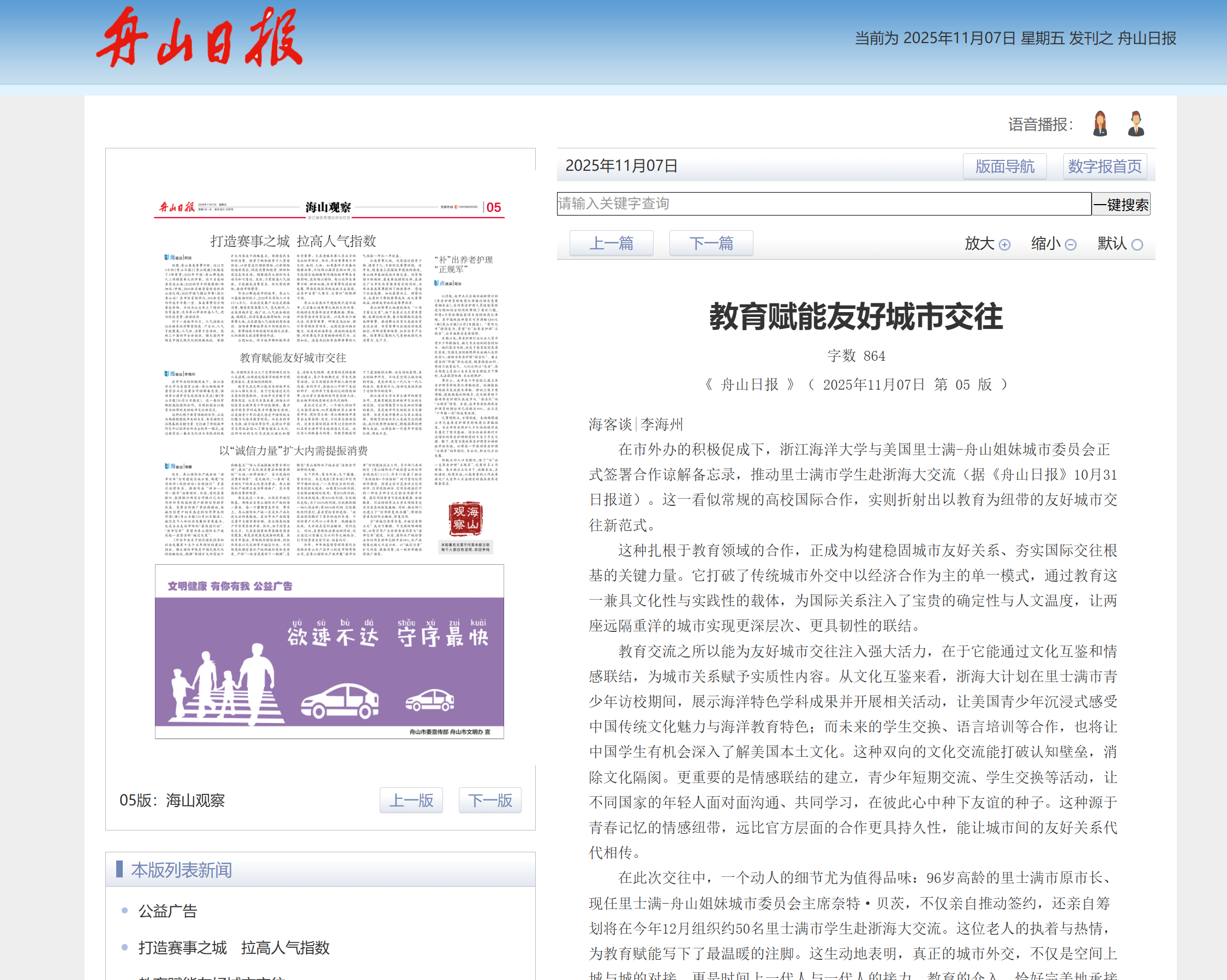 在市外办的积极促成下,浙江海洋大学与美国里士满-舟山姐妹城市委员会正式签署合作谅解备忘录,推动里士满市学生赴浙海大交流(据《舟山日报》10月31日报道)。这一看似常规的高校国际合作,实则折射出以教育为纽带的友好城市交往新范式。这种扎根于教育领域的合作,正成为构建稳固城市友好关系、夯实国际交往根基的关键力量。它打破了传统城市外交中以经济合作为主的单一模式,通过教育这一兼具文化性与实践性的载体,为国际关...