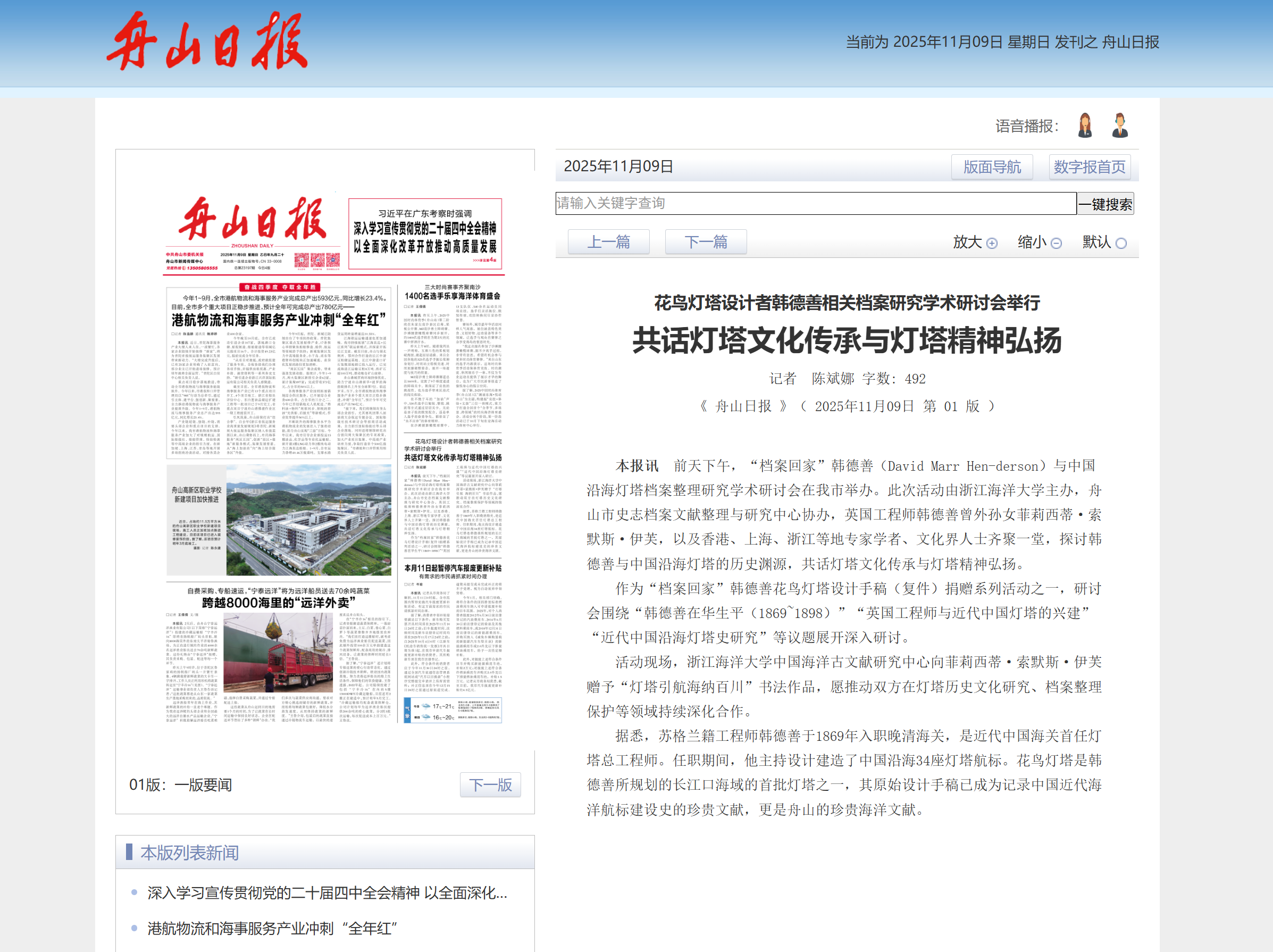 11月7日下午,“档案回家”韩德善(DavidMarrHen-derson)与中国沿海灯塔档案整理研究学术研讨会在我市举办。此次活动由浙江海洋大学主办,舟山市史志档案文献整理与研究中心协办,英国工程师韩德善曾外孙女菲莉西蒂·索默斯·伊芙,以及香港、上海、浙江等地专家学者、文化界人士齐聚一堂,探讨韩德善与中国沿海灯塔的历史渊源,共话灯塔文化传承与灯塔精神弘扬。作为“档案回家”韩德善花鸟灯塔设计手稿(复件)捐赠系列活动之...