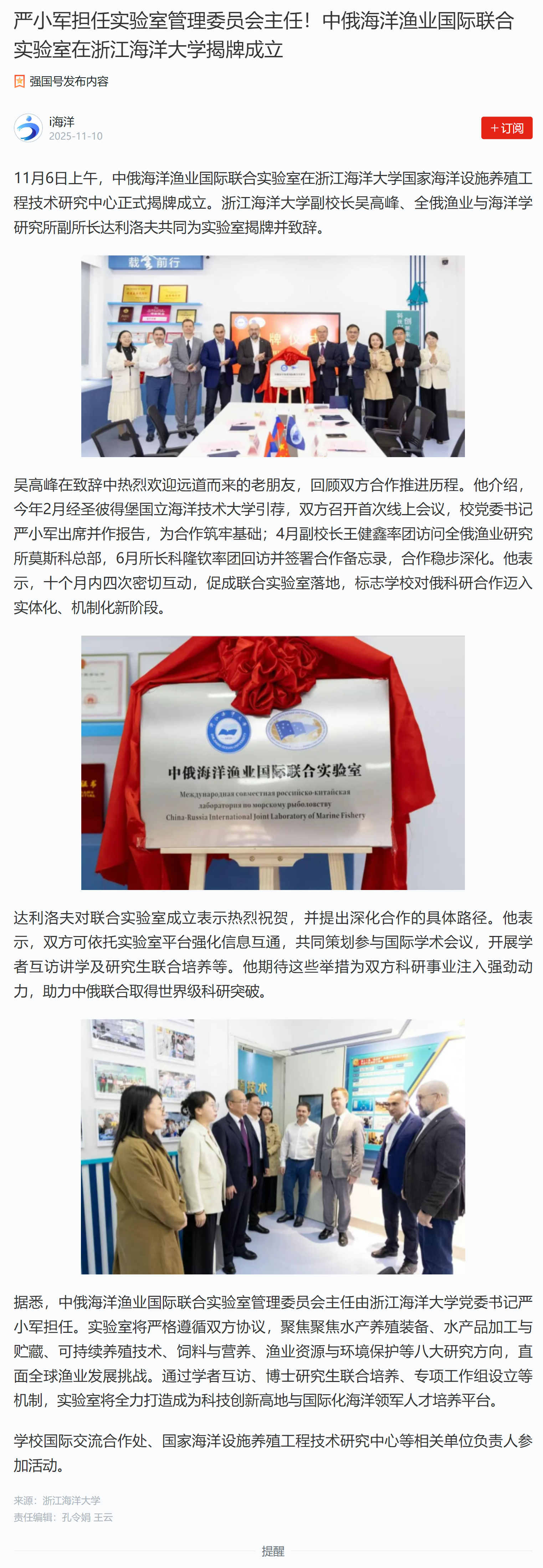 11月6日上午,中俄海洋渔业国际联合实验室在浙江海洋大学国家海洋设施养殖工程技术研究中心正式揭牌成立。浙江海洋大学副校长吴高峰、全俄渔业与海洋学研究所副所长达利洛夫共同为实验室揭牌并致辞。吴高峰在致辞中热烈欢迎远道而来的老朋友,回顾双方合作推进历程。他介绍,今年2月经圣彼得堡国立海洋技术大学引荐,双方召开首次线上会议,校党委书记严小军出席并作报告,为合作筑牢基础;4月副校长王健鑫率团访问全俄渔业研究...