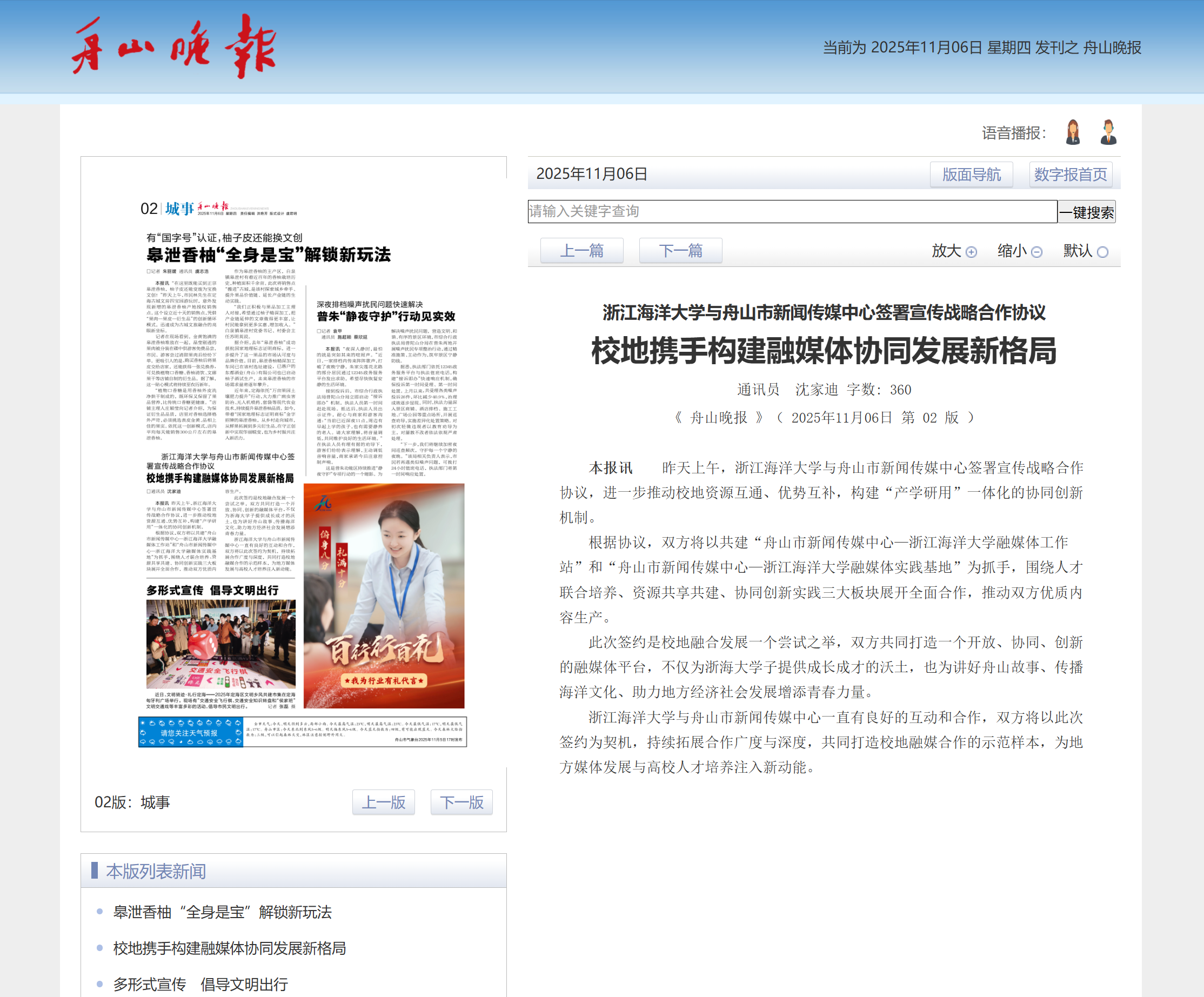 本报讯昨天上午,浙江海洋大学与舟山市新闻传媒中心签署宣传战略合作协议,进一步推动校地资源互通、优势互补,构建“产学研用”一体化的协同创新机制。根据协议,双方将以共建“舟山市新闻传媒中心—浙江海洋大学融媒体工作站”和“舟山市新闻传媒中心—浙江海洋大学融媒体实践基地”为抓手,围绕人才联合培养、资源共享共建、协同创新实践三大板块展开全面合作,推动双方优质内容生产。此次签约是校地融合发展一个尝试之举,...