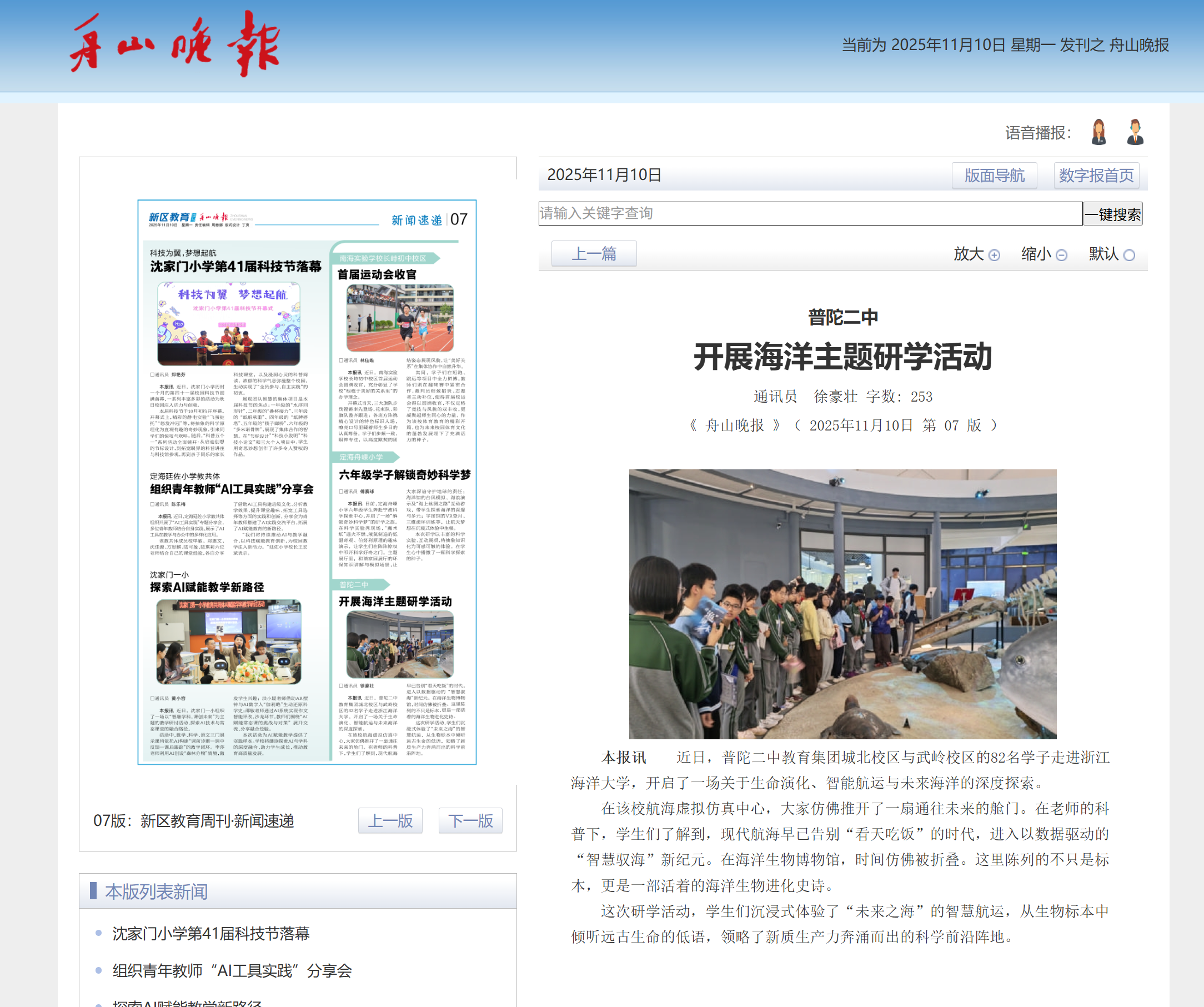 近日,普陀二中教育集团城北校区与武岭校区的82名学子走进浙江海洋大学,开启了一场关于生命演化、智能航运与未来海洋的深度探索。在该校航海虚拟仿真中心,大家仿佛推开了一扇通往未来的舱门。在老师的科普下,学生们了解到,现代航海早已告别“看天吃饭”的时代,进入以数据驱动的“智慧驭海”新纪元。在海洋生物博物馆,时间仿佛被折叠。这里陈列的不只是标本,更是一部活着的海洋生物进化史诗。这次研学活动,学生们沉浸式...
